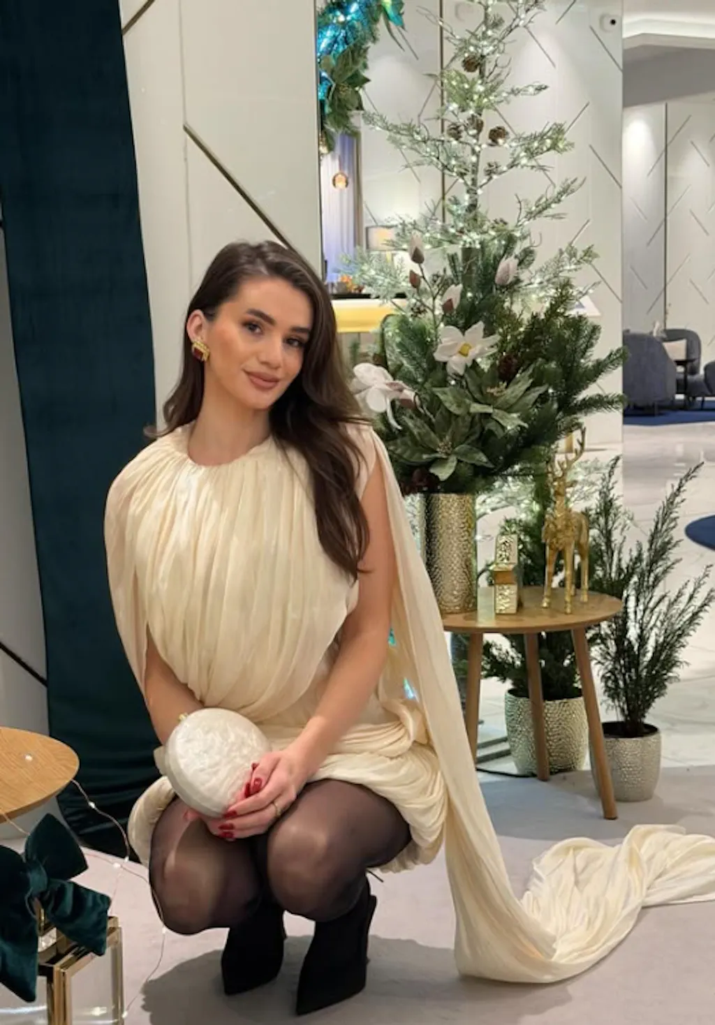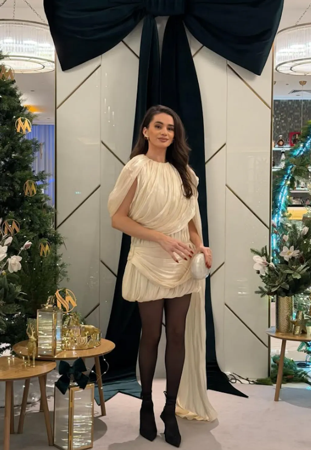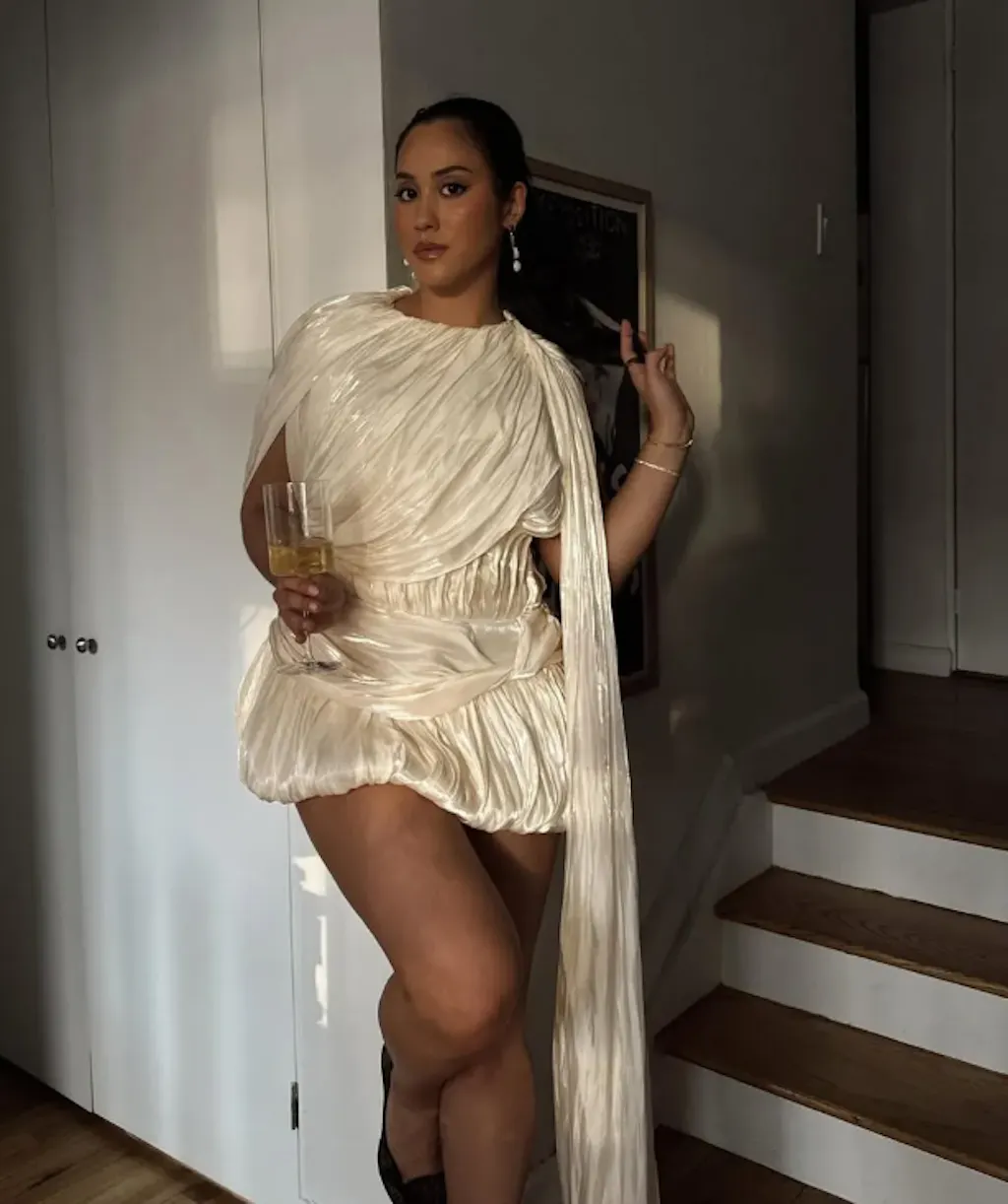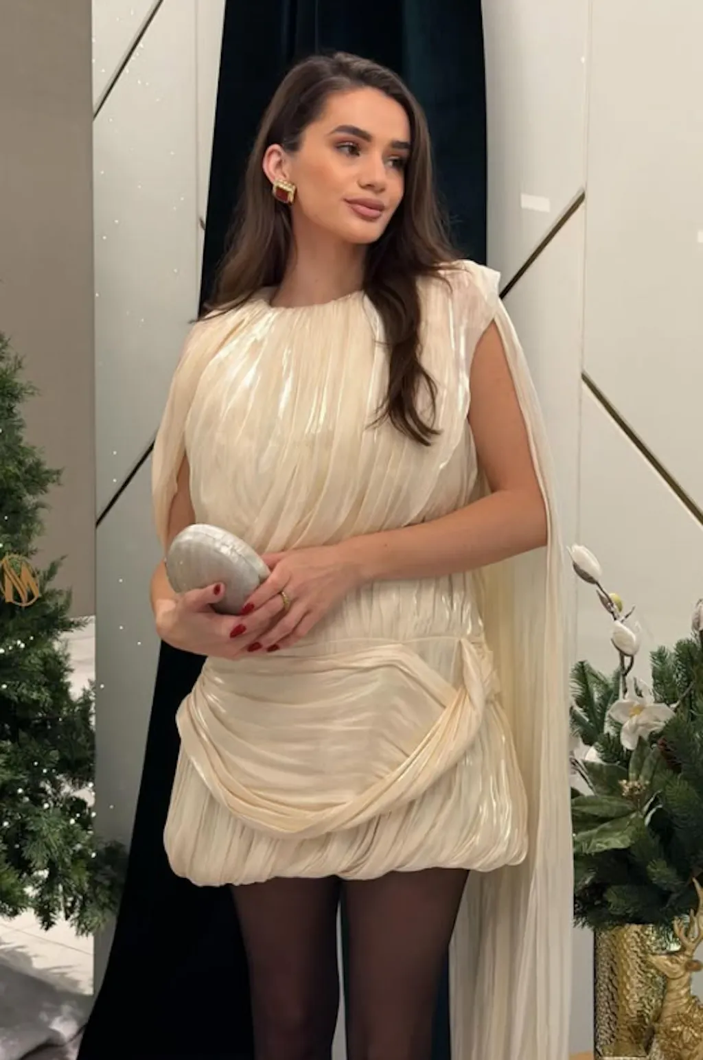 I wore this dress to a party and absolutely loved how it looked. The draped bodice and cape detail make it stand out.