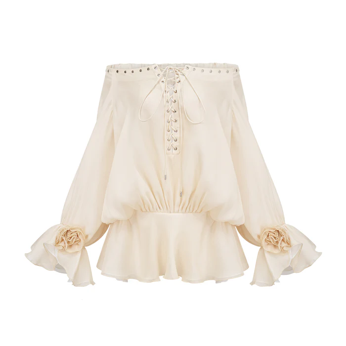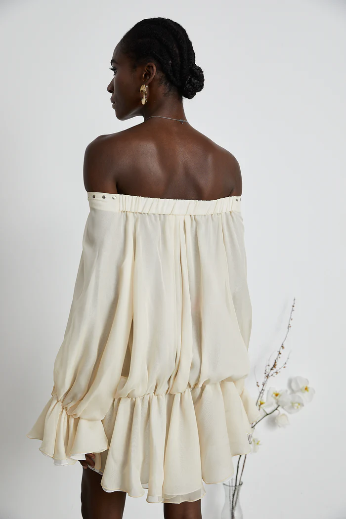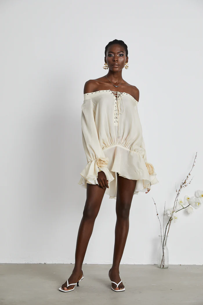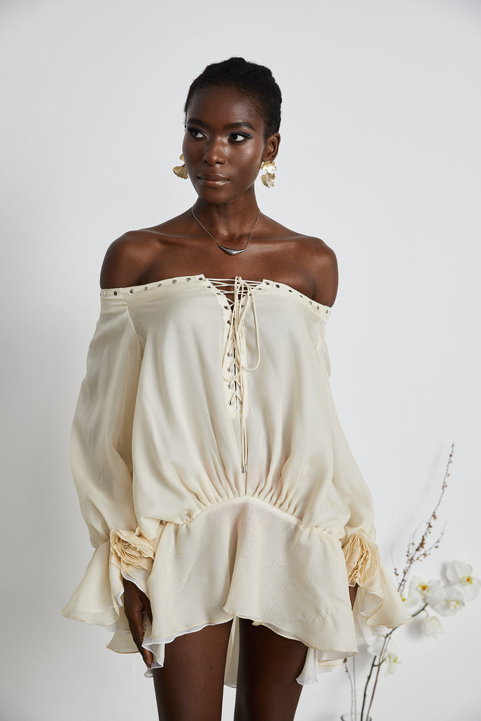 Elegant and lightweight, this off-shoulder chiffon mini dress features soft semi-sheer fabric, long sleeves, and double-layered construction. The front lace-up tie and flared hem create a flattering silhouette, perfect for summer parties, brunches, and casual evening events.