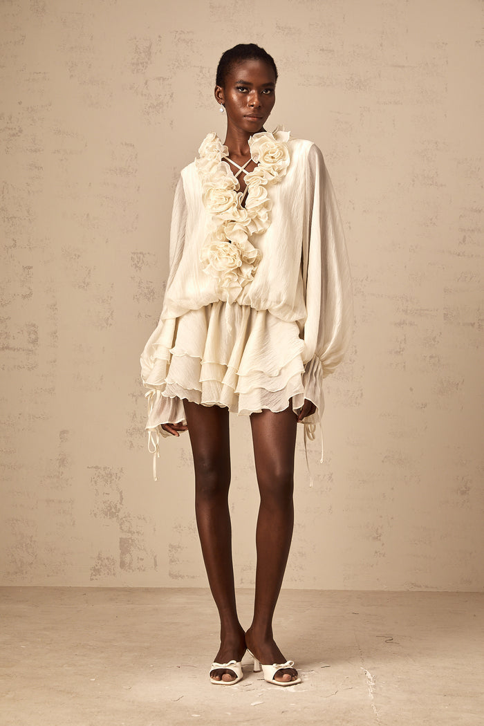Romantic and airy, this mini dress features a V-neck, long puff sleeves with flared cuffs, and floral appliqués throughout. The tiered skirt, ruffled detailing, and self-tie waist create a flattering silhouette, perfect for garden parties, brunches, and summer events.