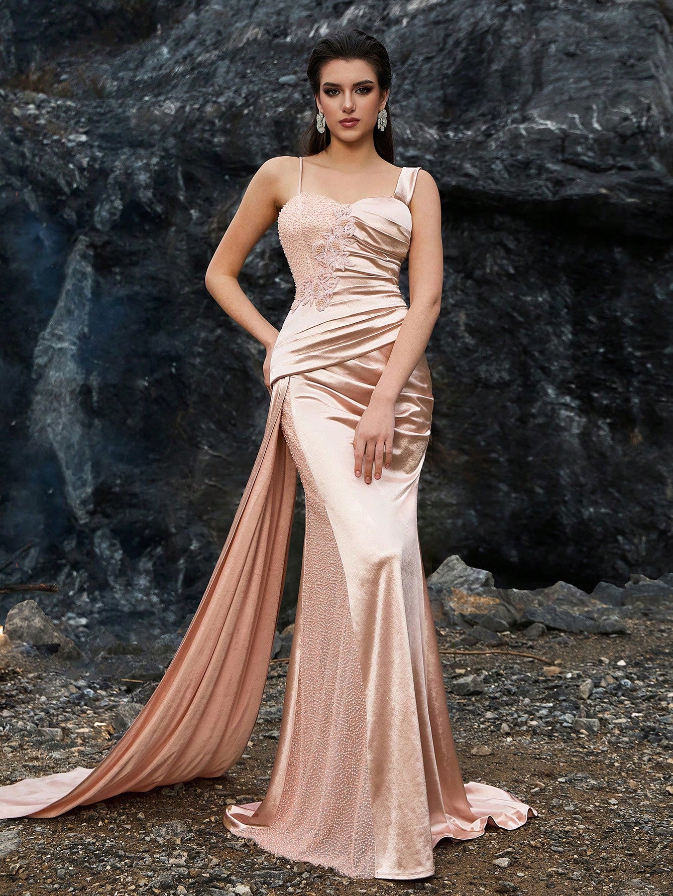 This glamorous blush satin mermaid gown features an asymmetrical neckline, delicate lace embroidery on the bodice, and a flowing fixed train. Its sleek, figure-hugging design is perfect for weddings, galas, and formal events.