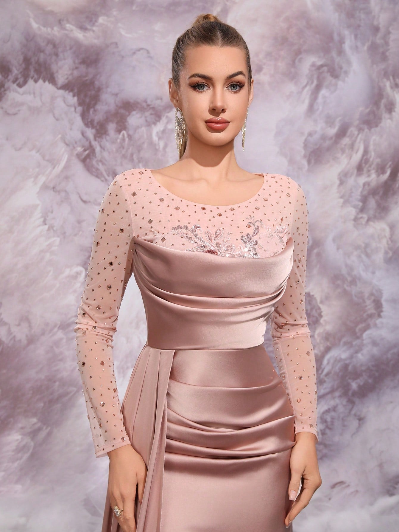 Romantic Soft Pink Satin Evening Gown with Beaded Long Sleeves, Elegant Luxury Wedding Guest Dress for Galas and Formal Events