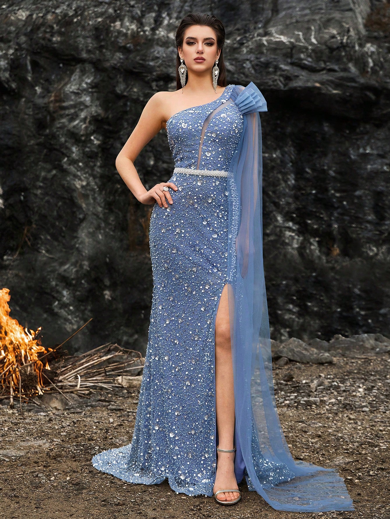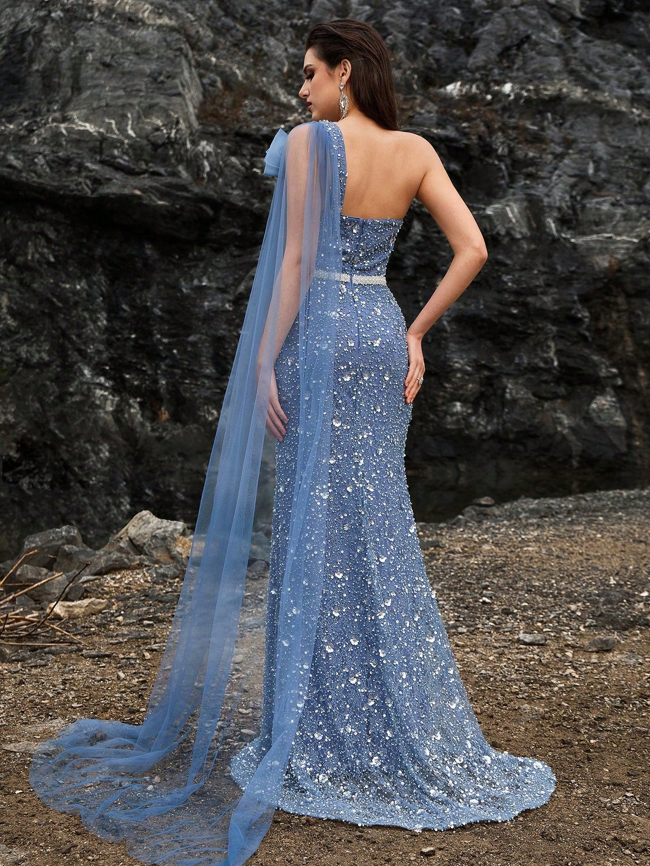 Luxury Royal Blue Beaded Evening Gown with Sheer Cape Shawl, Elegant Asymmetrical Neckline and High Slit for Red Carpet, Weddings and Formal Events