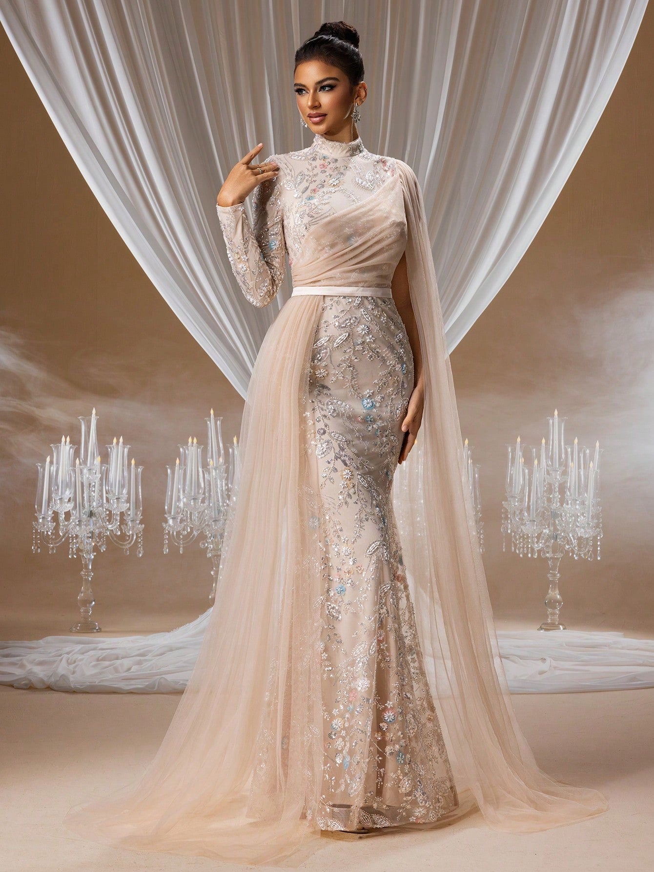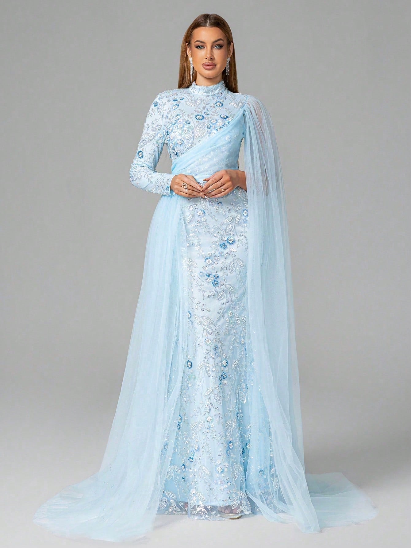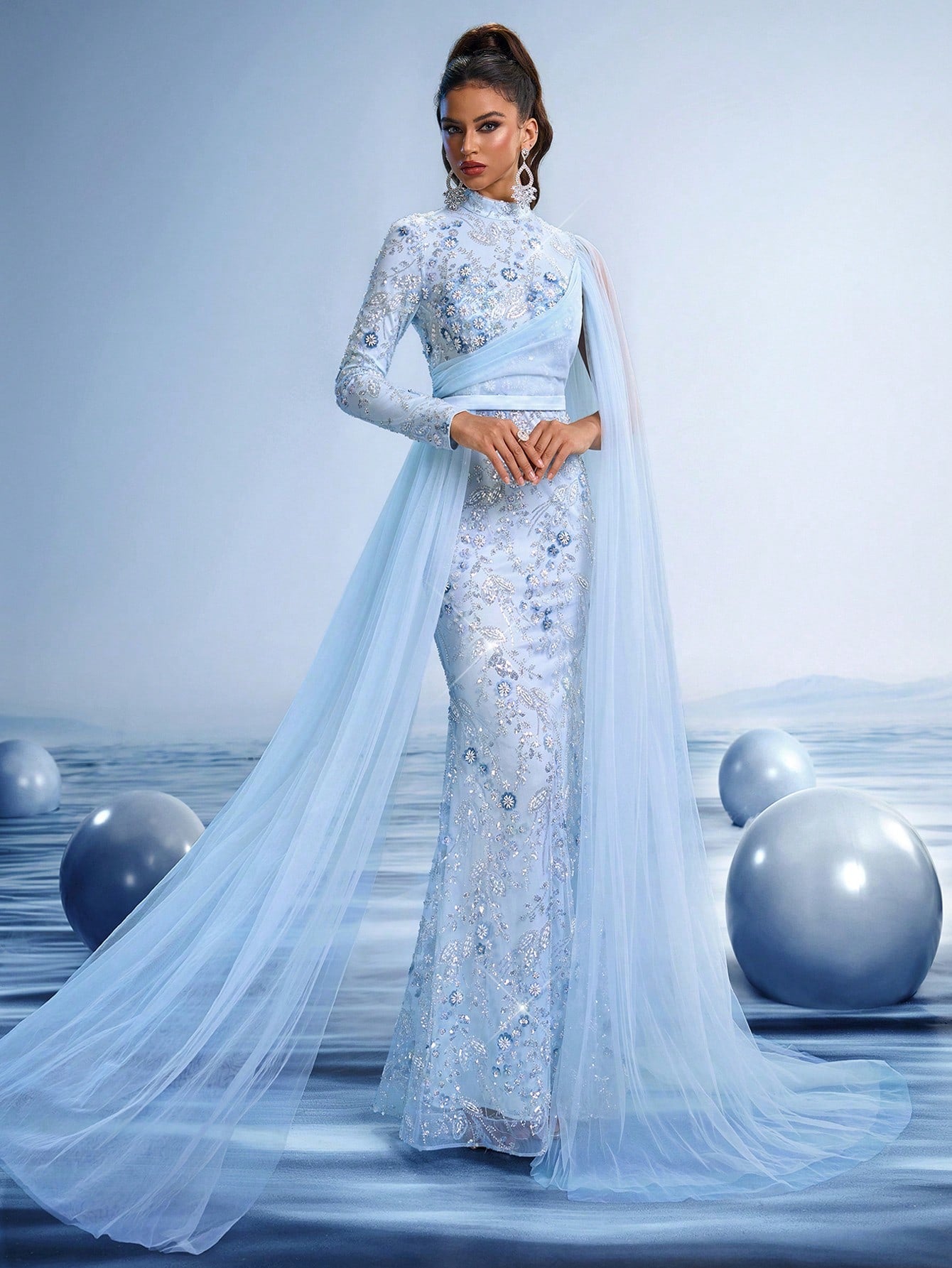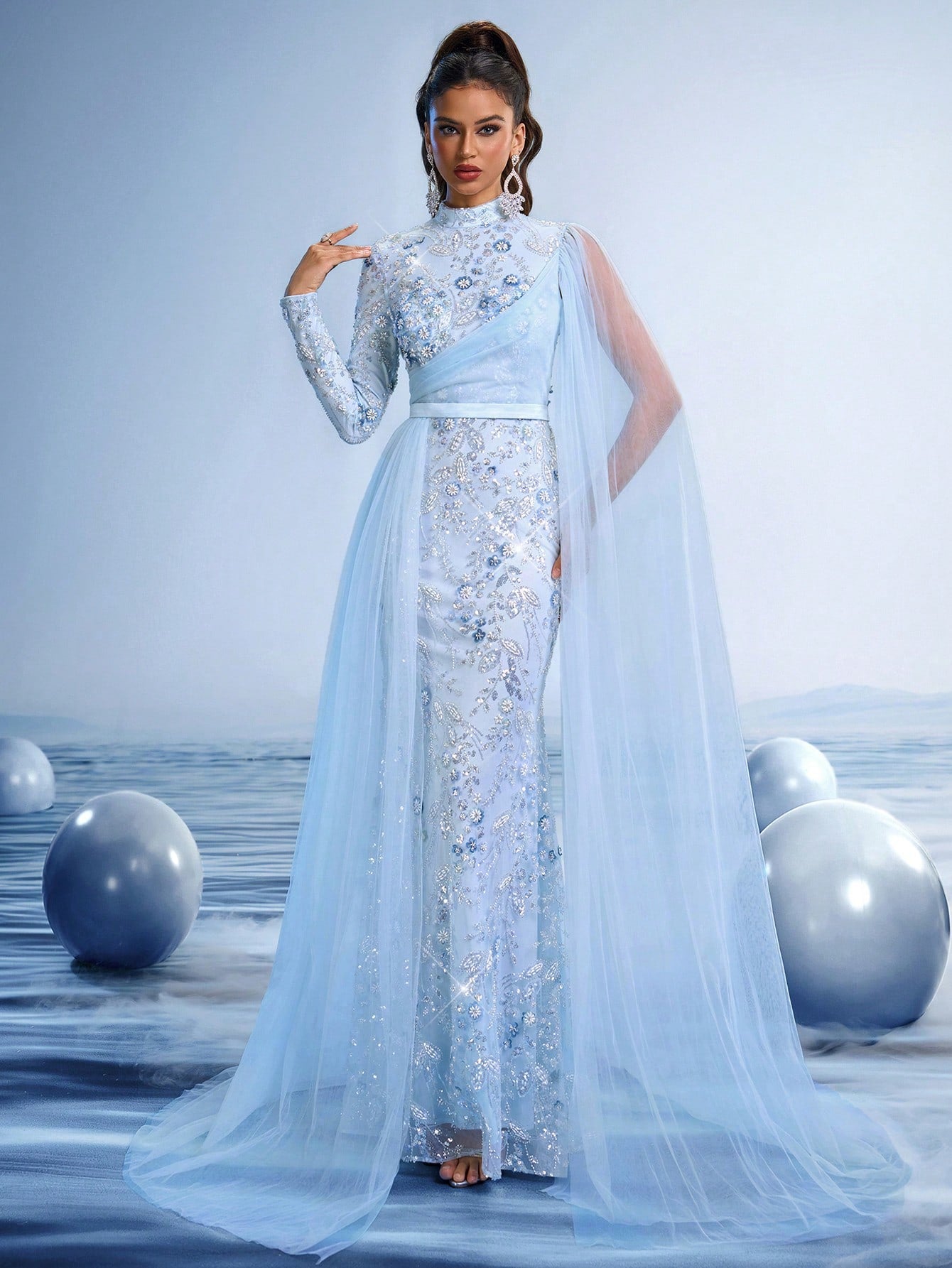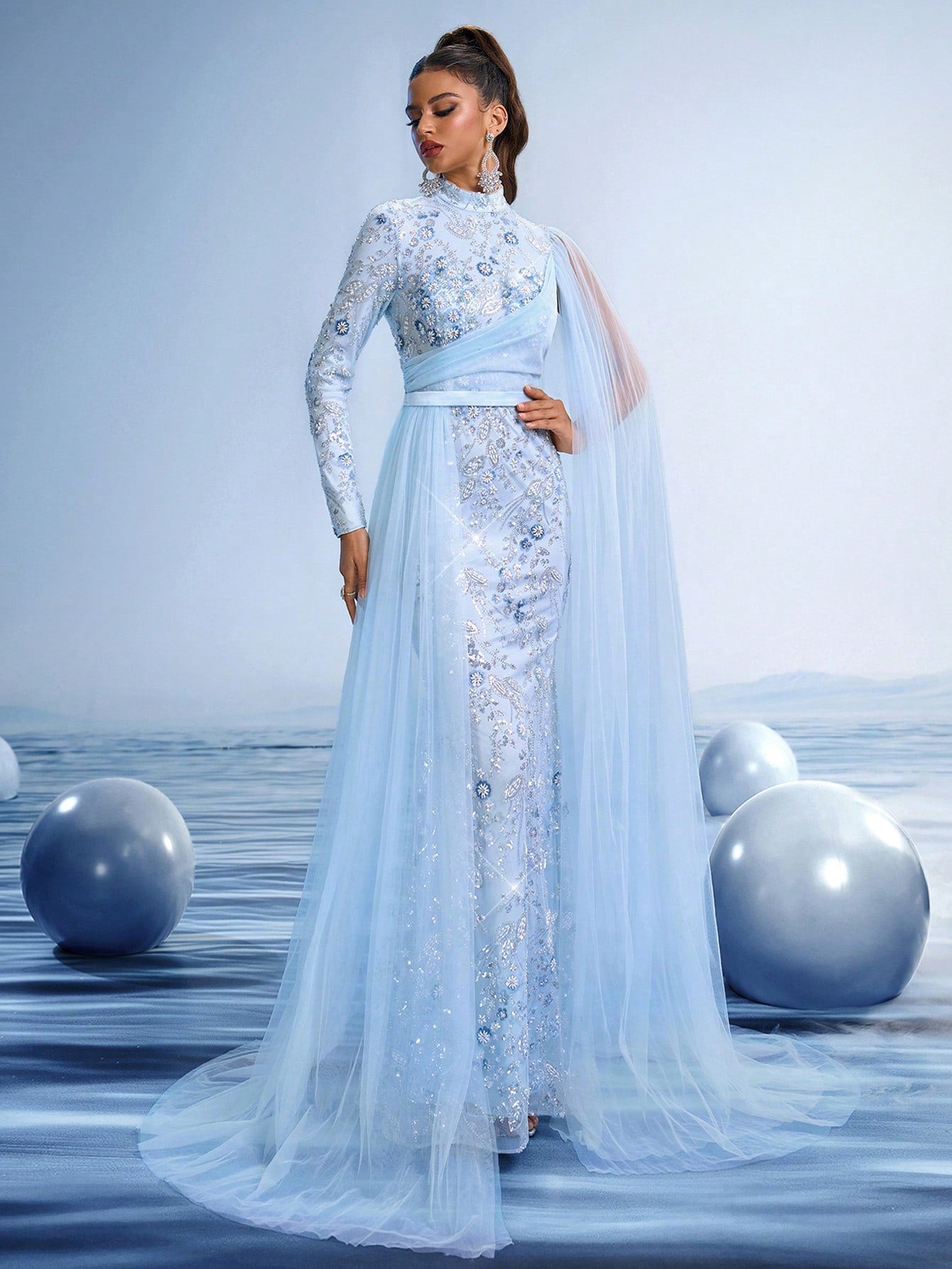 Sky Blue Crystal Embroidered Evening Gown with Sheer Cape and Flowing Sleeves