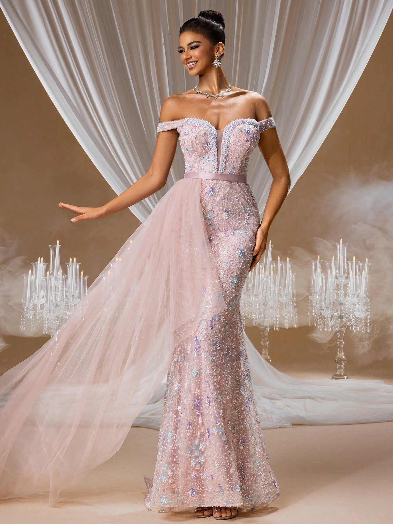 Pink Illusion Neckline Evening Gown with 3D Floral Lace Appliqués and Layered Tulle, Elegant Wedding Guest Dress
