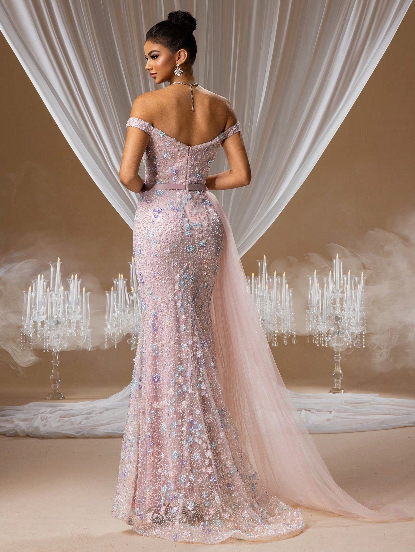 Increase quantity for Pink Illusion Neckline Evening Gown with 3D Floral Lace Appliqués and Layered Tulle, Elegant Wedding Guest Dress