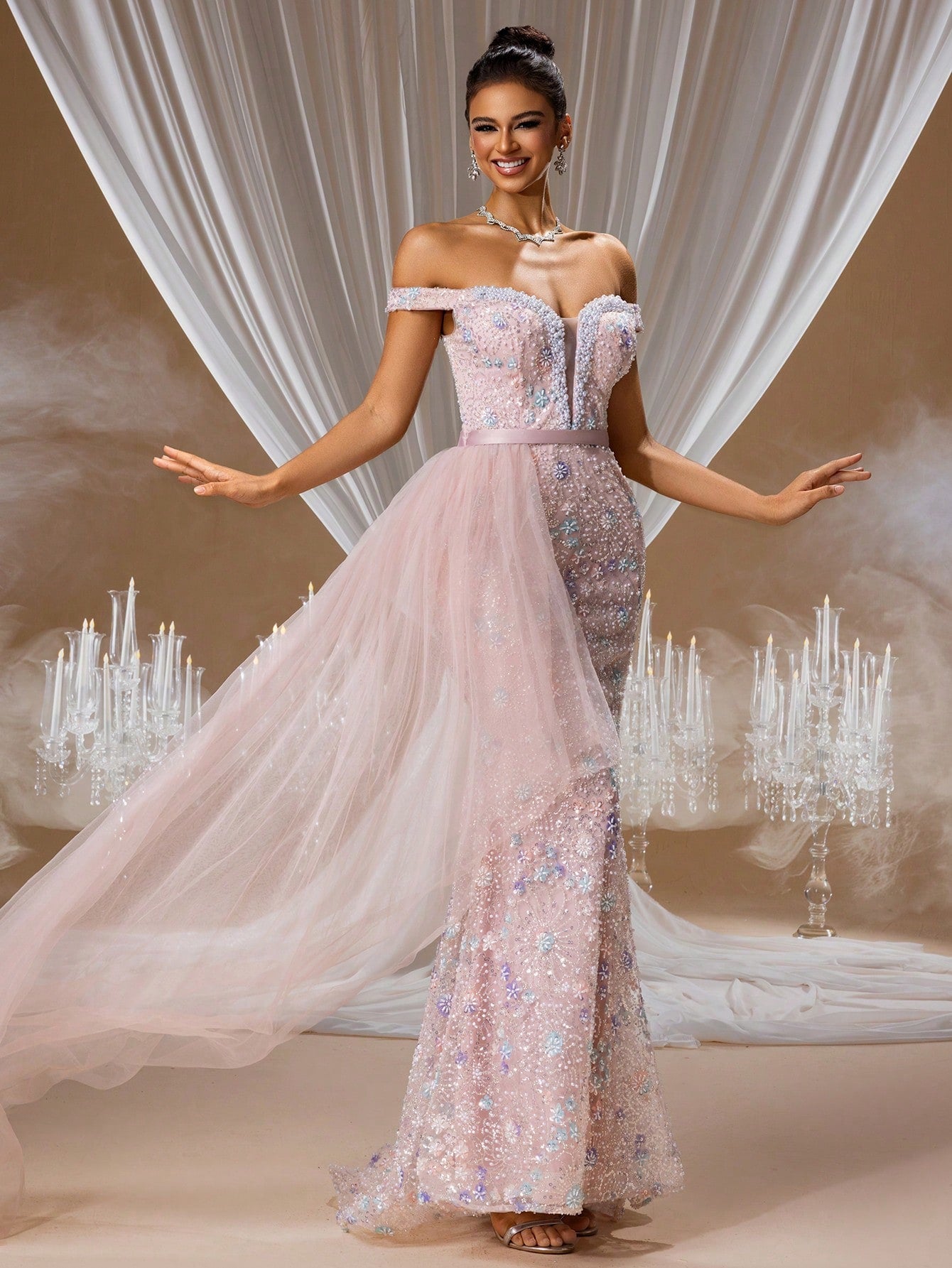 Decrease quantity for Pink Illusion Neckline Evening Gown with 3D Floral Lace Appliqués and Layered Tulle, Elegant Wedding Guest Dress