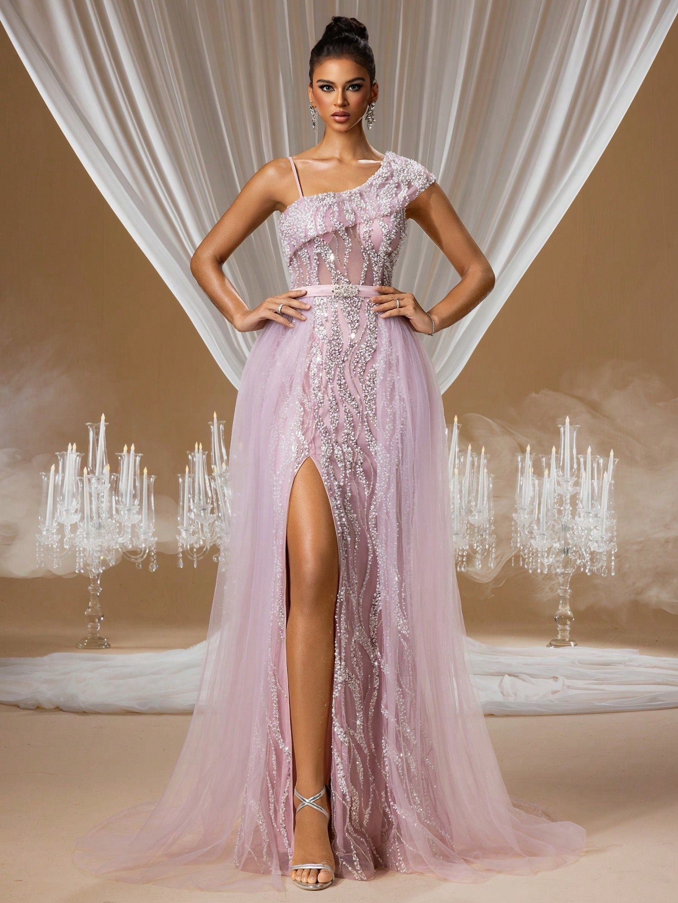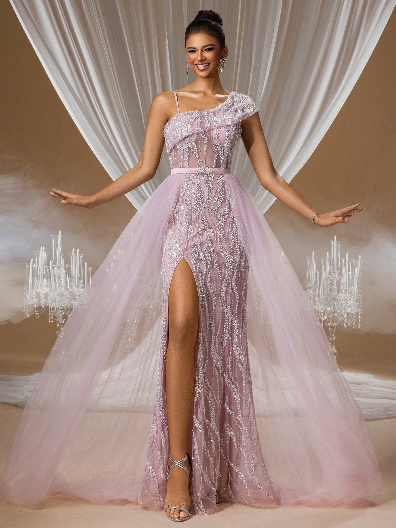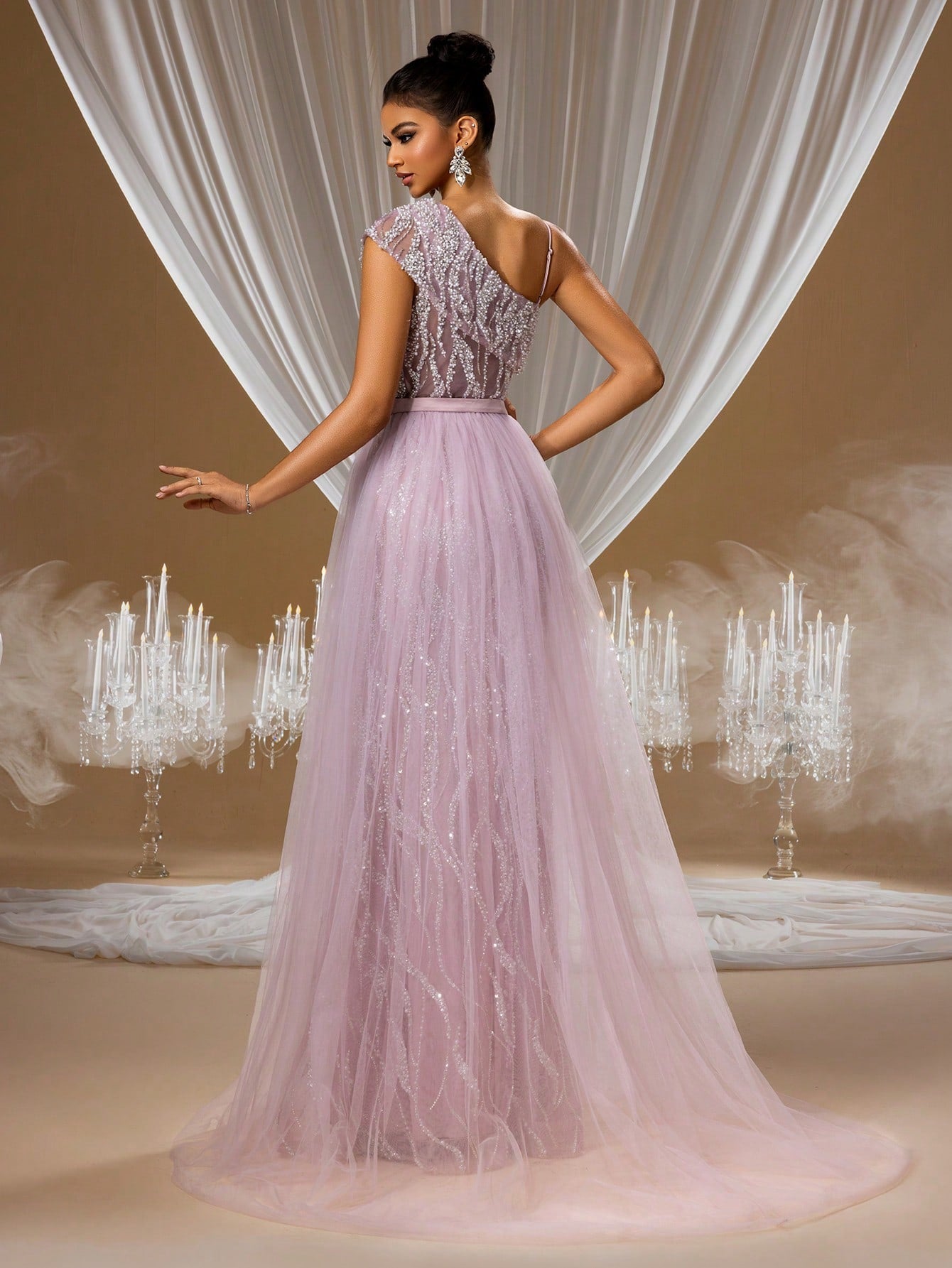 Increase quantity for Charming Lavender Quartz Crystal Embroidered Mermaid Evening Gown with One-Shoulder Illusion Design and Layered Tulle Skirt