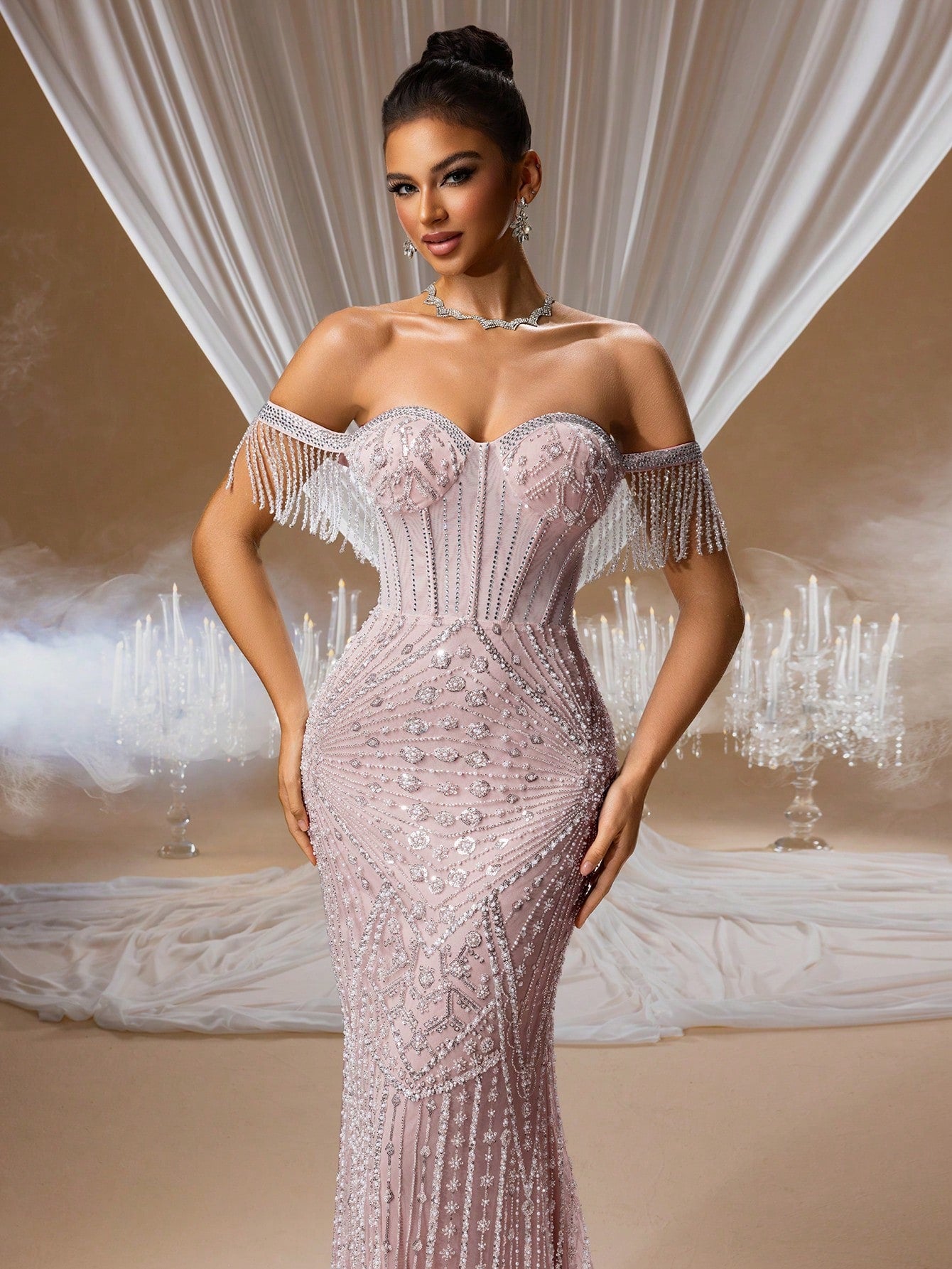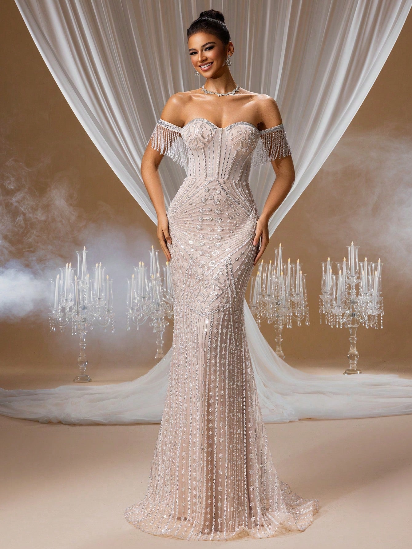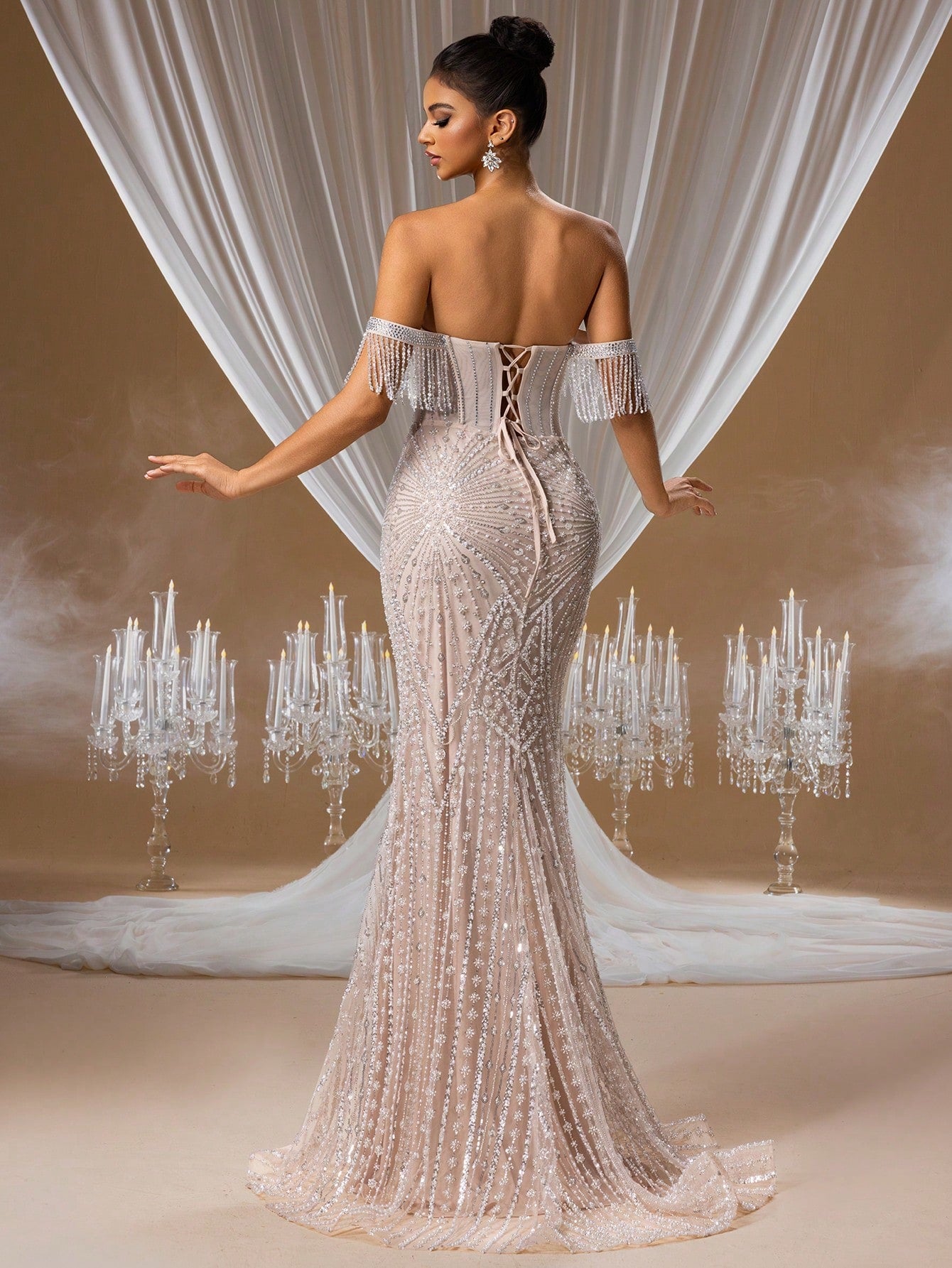 Luxury Red Carpet Evening Gown and Wedding Guest Ball Dress with Stunning Beaded Elegance, Perfect for Galas and Formal Events