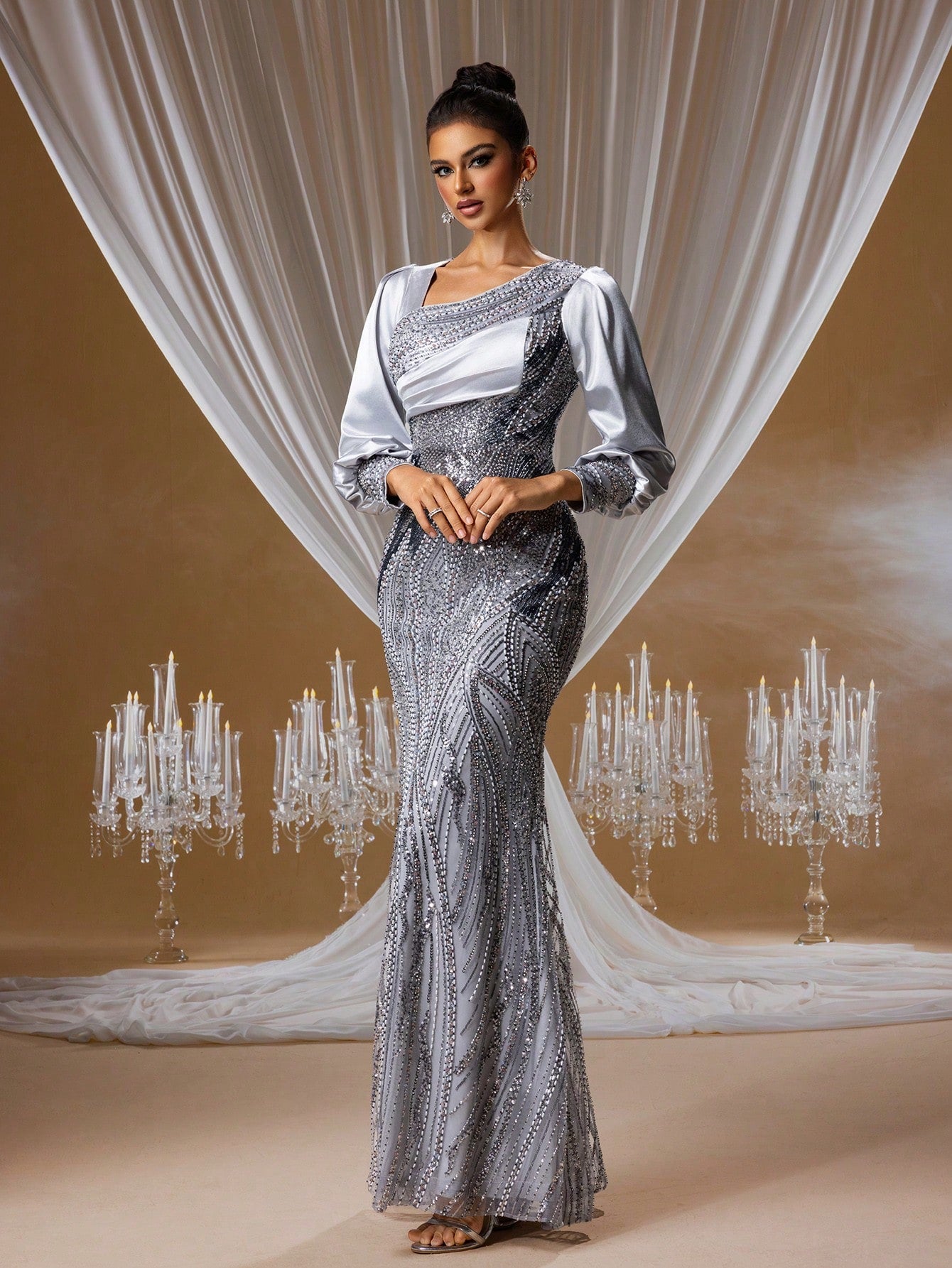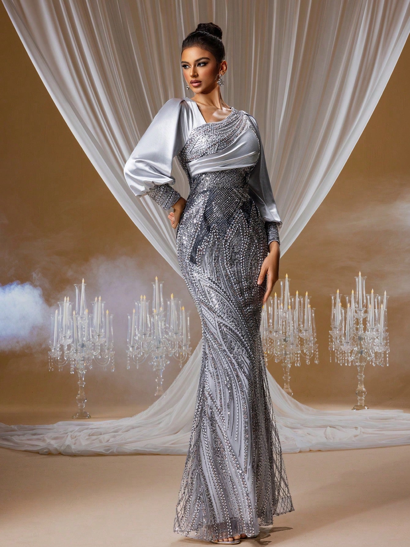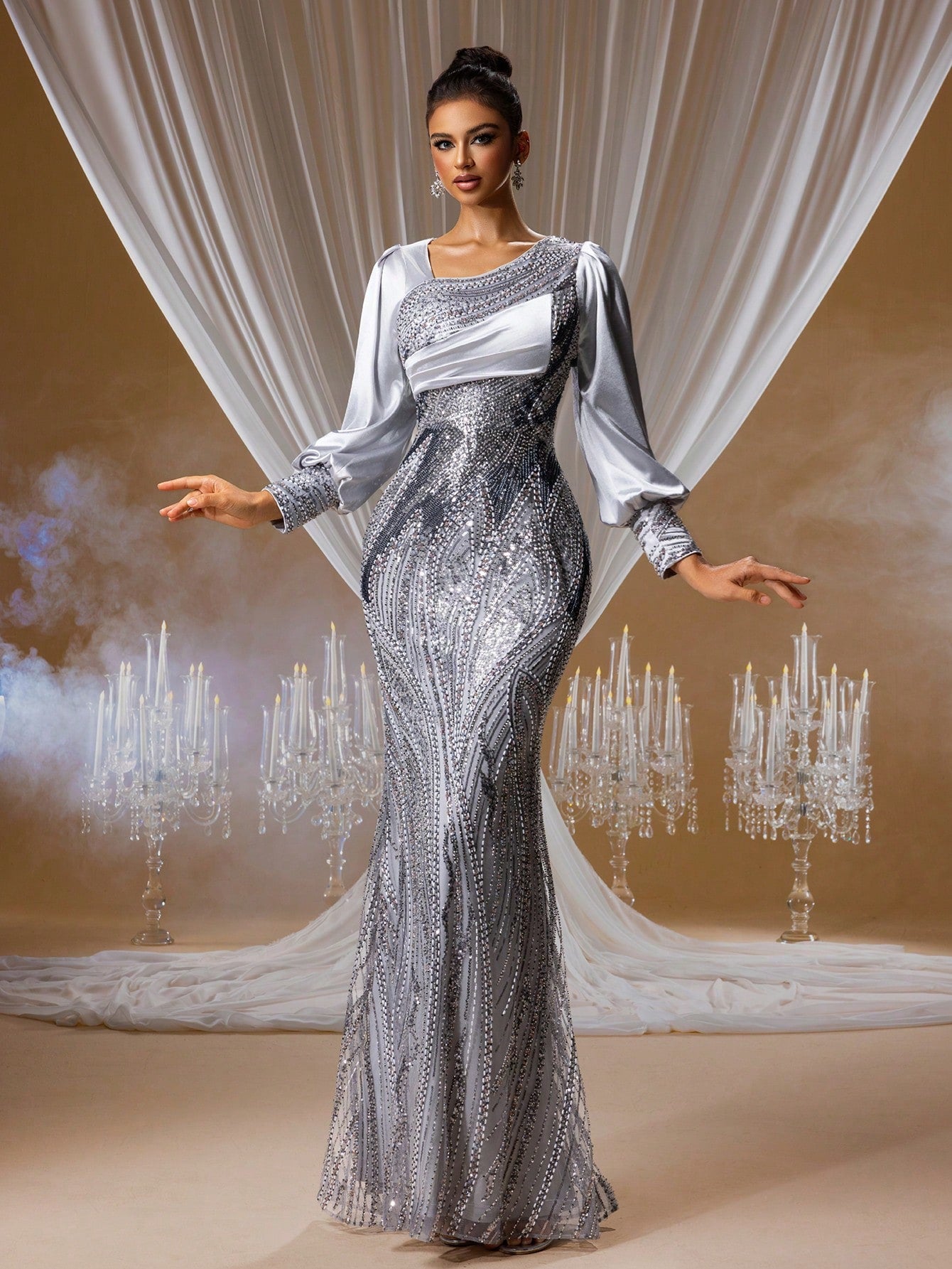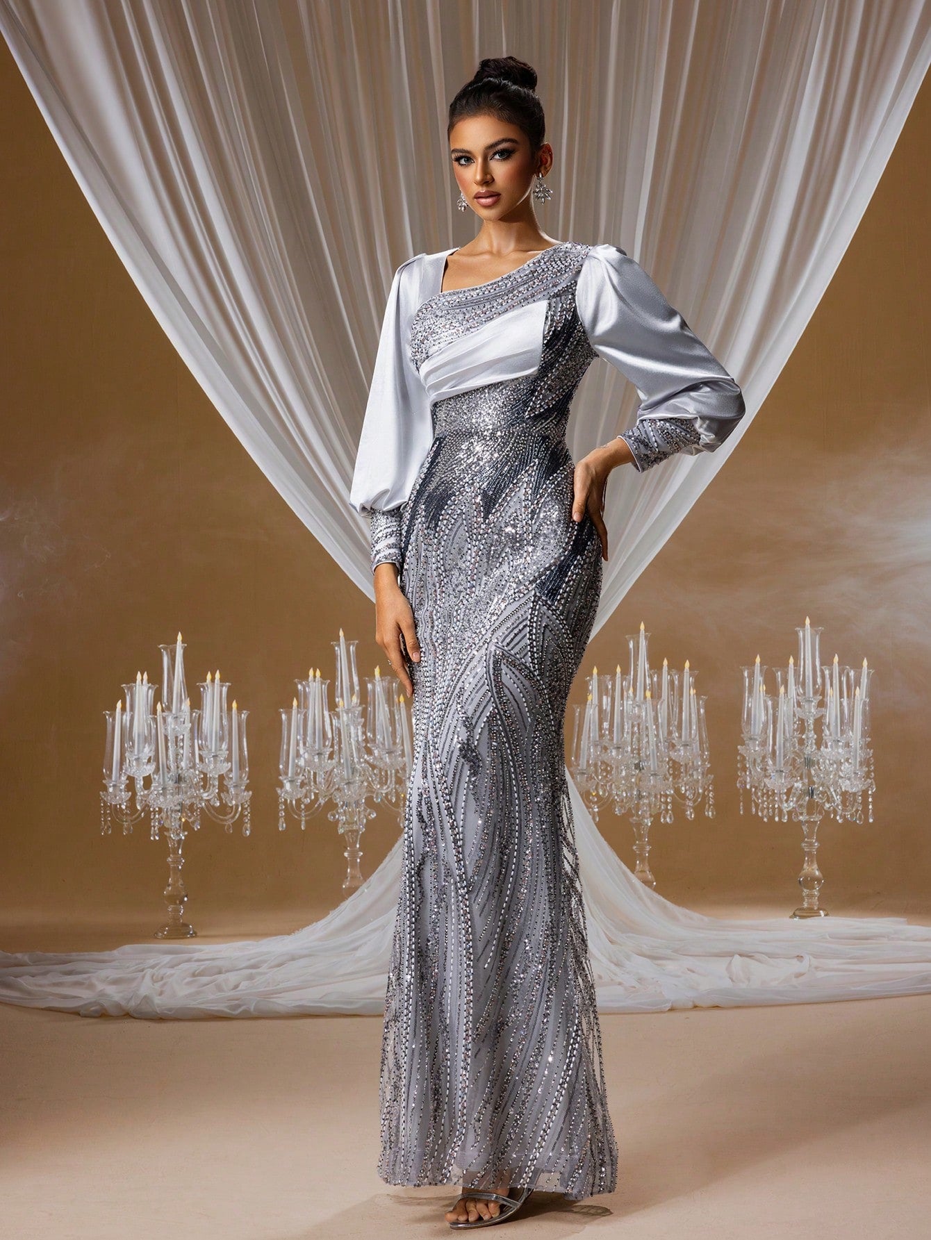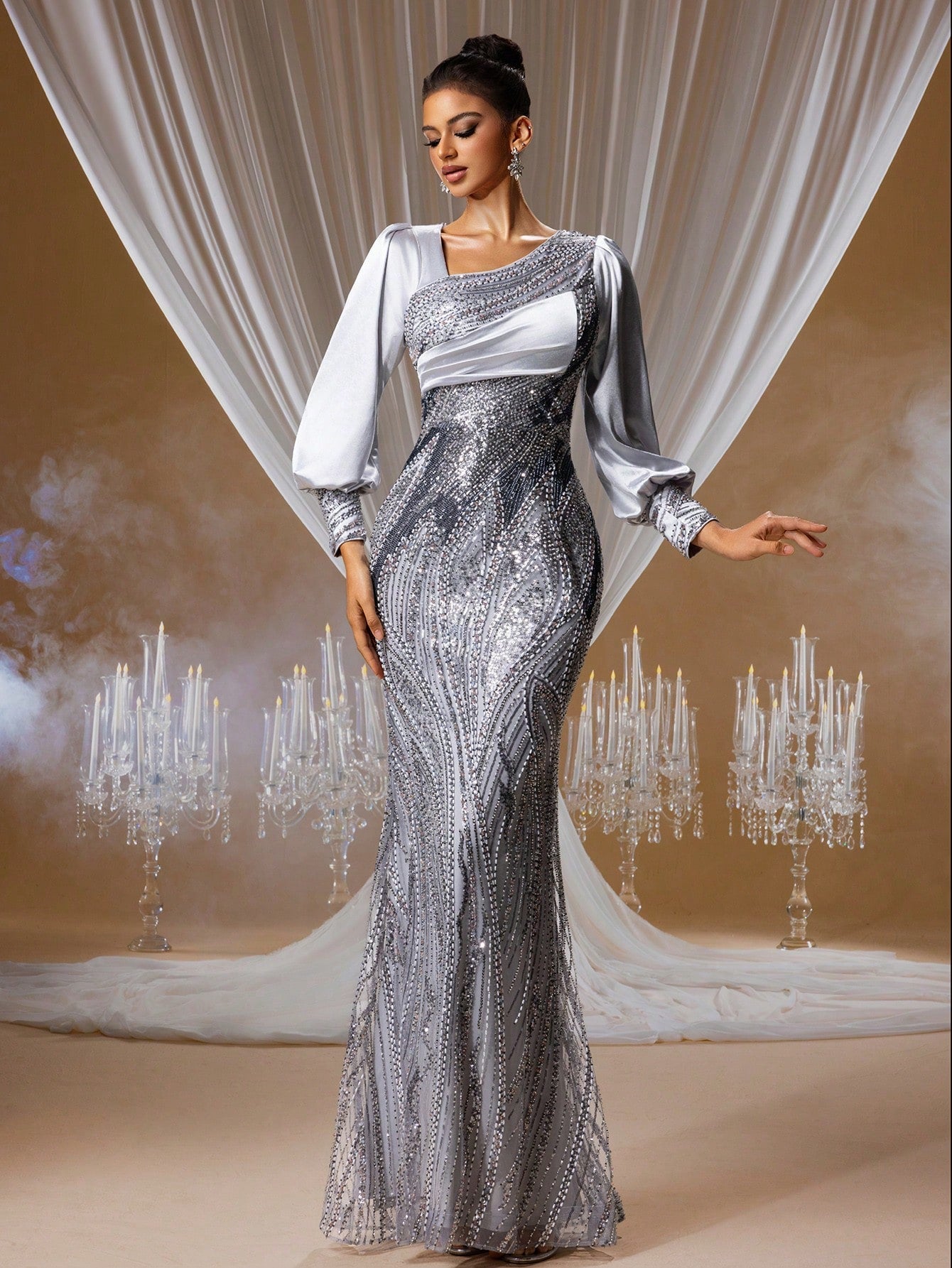 Silver Sequin One-Shoulder Lantern Sleeve Mermaid Evening Gown, Perfect for Formal Events, Parties and Wedding Guest Occasions