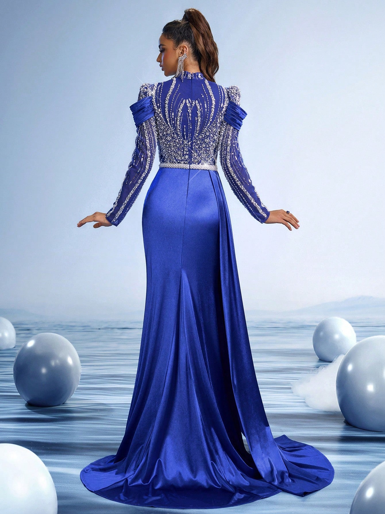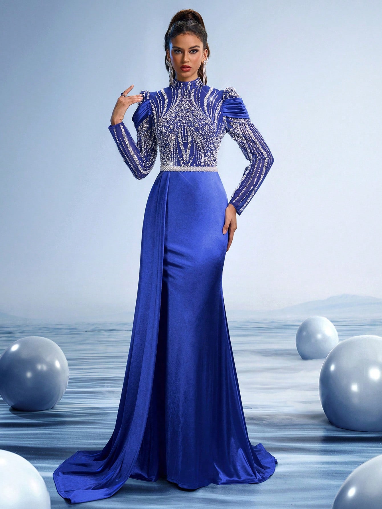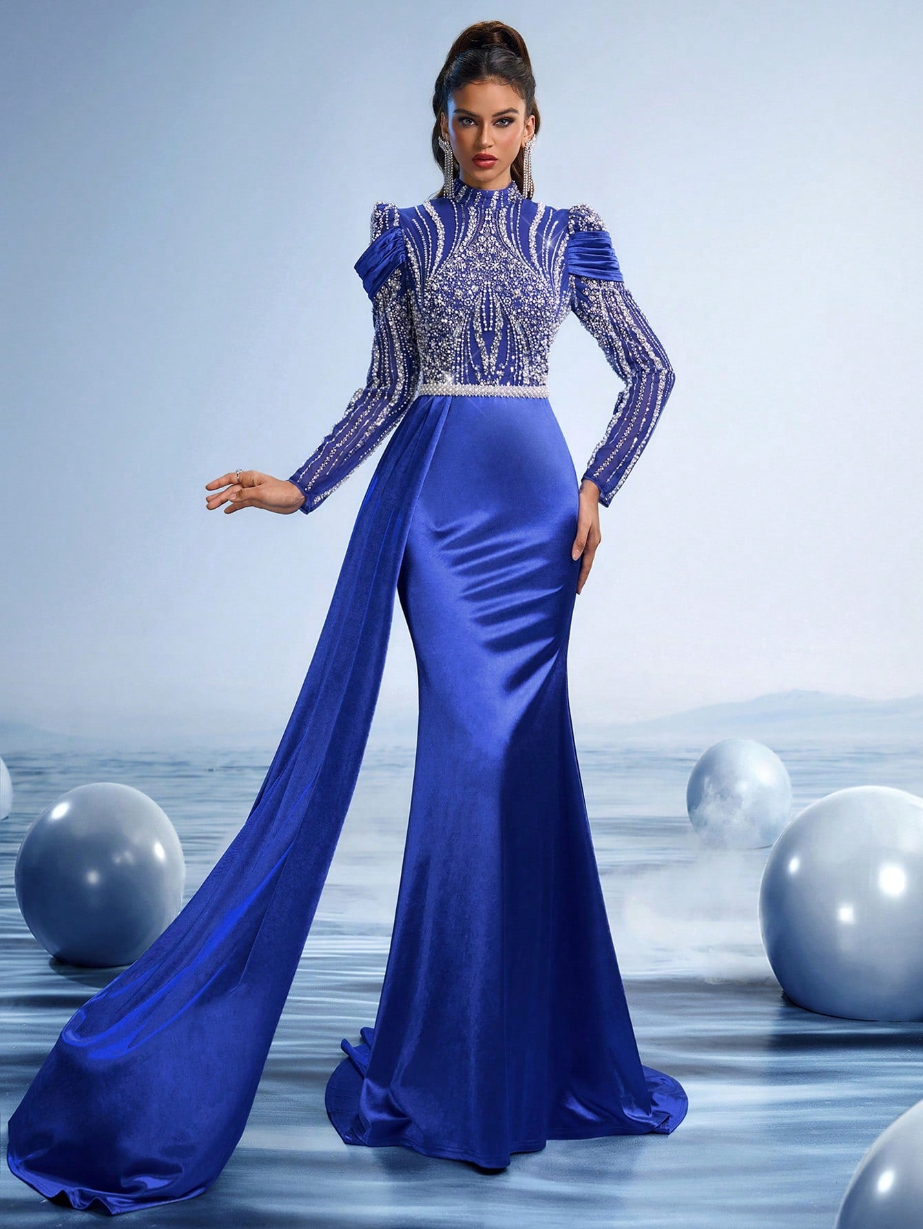 Increase quantity for Sapphire Veil Crystal Embroidered Mermaid Evening Gown with Draped Cape and High Neck, Luxury Hand-Beaded Red Carpet Dress