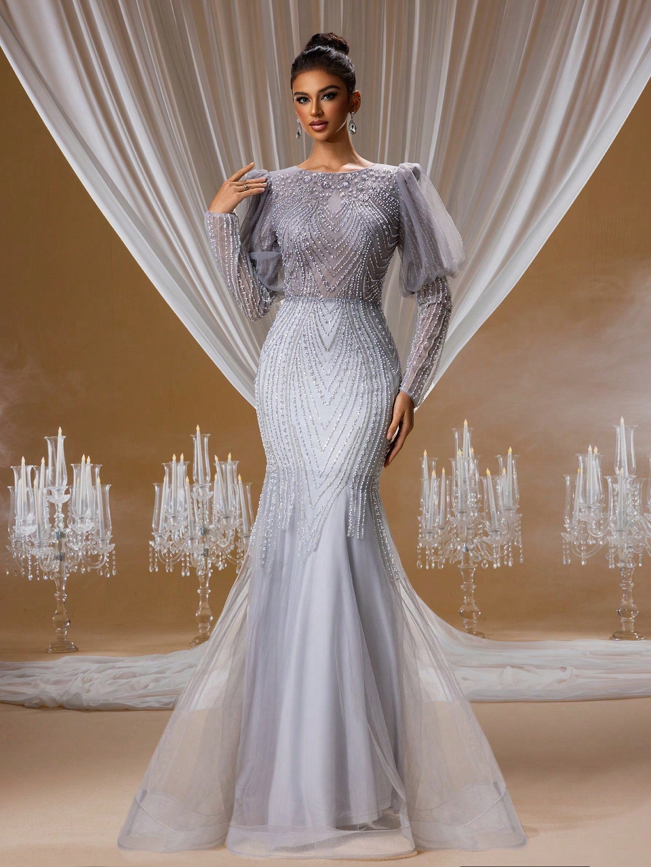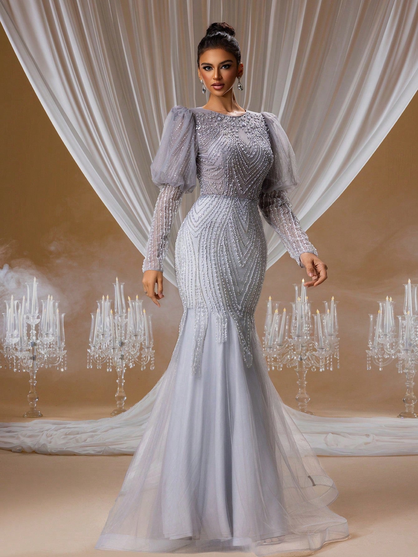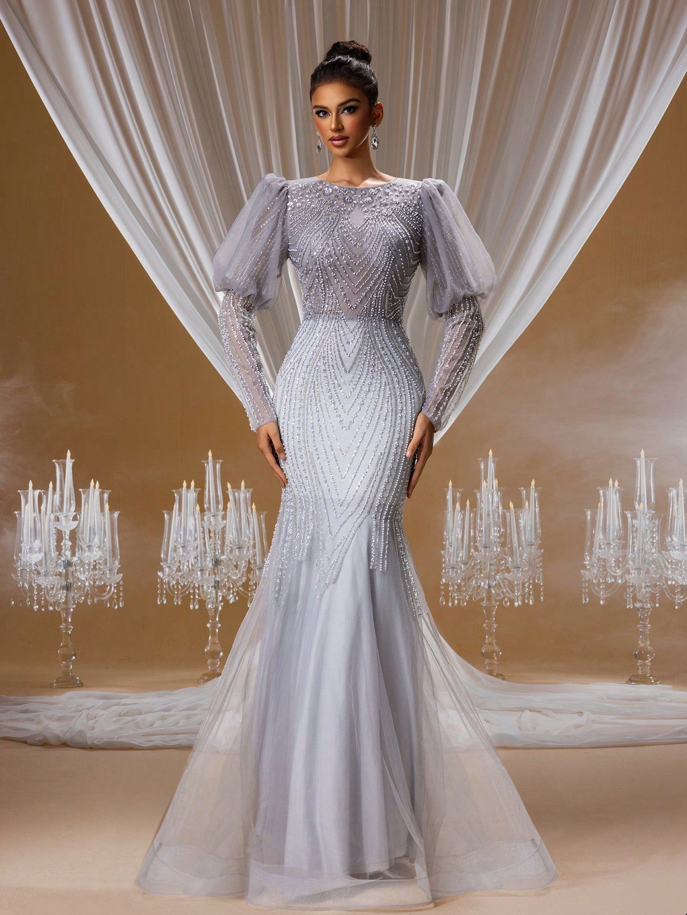 Luxury Hand-Beaded Mermaid Evening Gown with Puff Long Sleeves and Open Back Design, Elegant Formal Dress