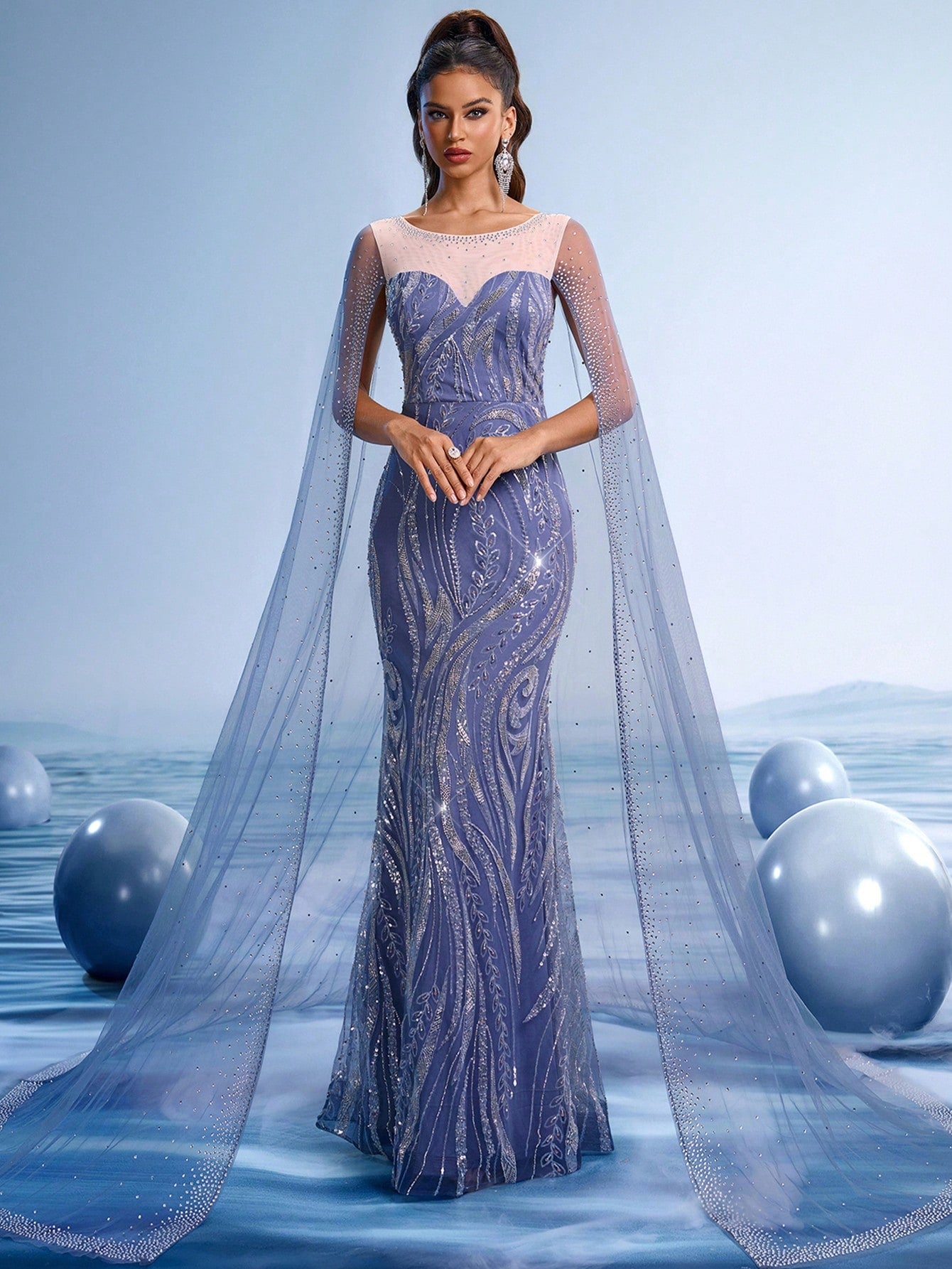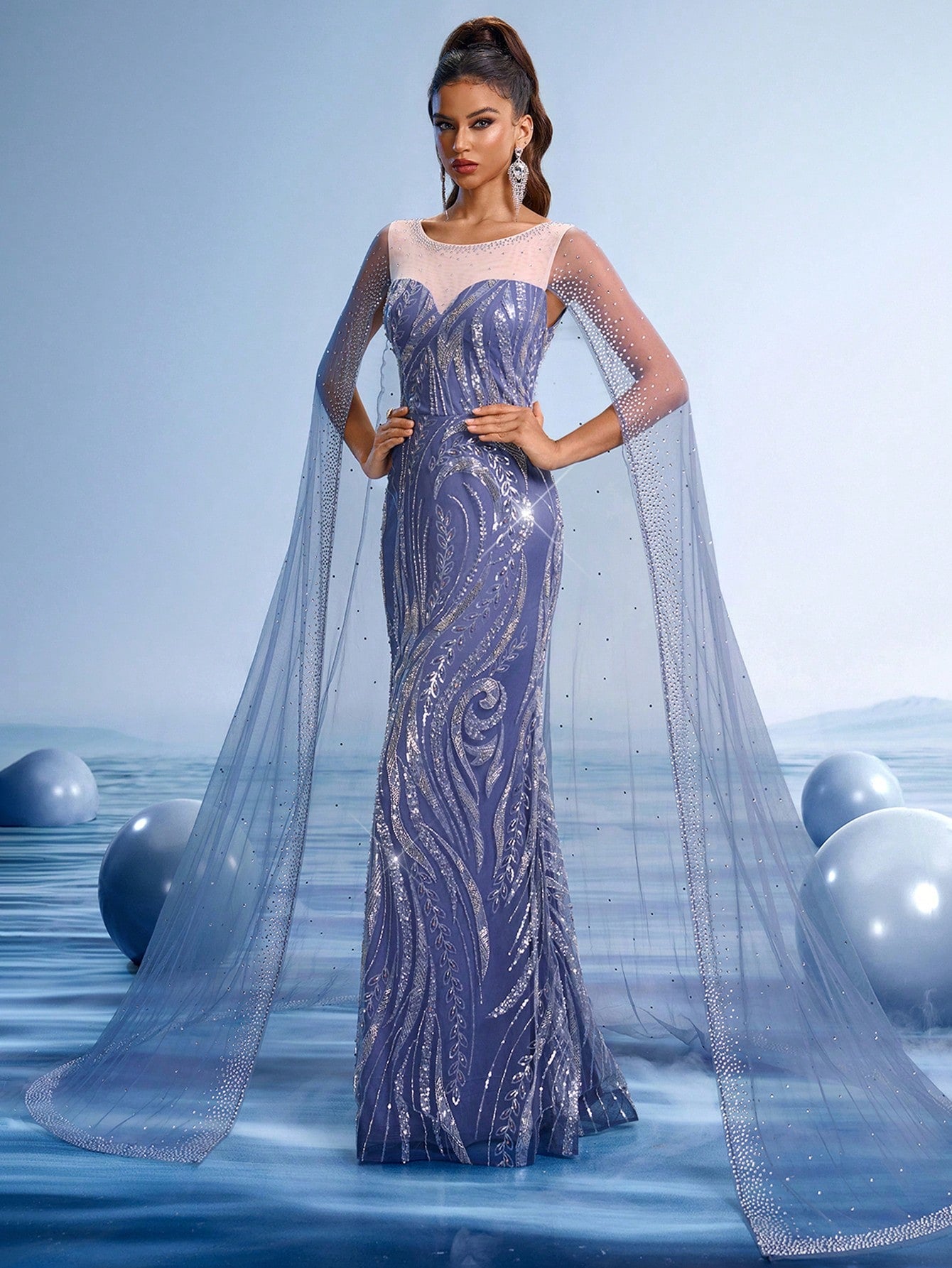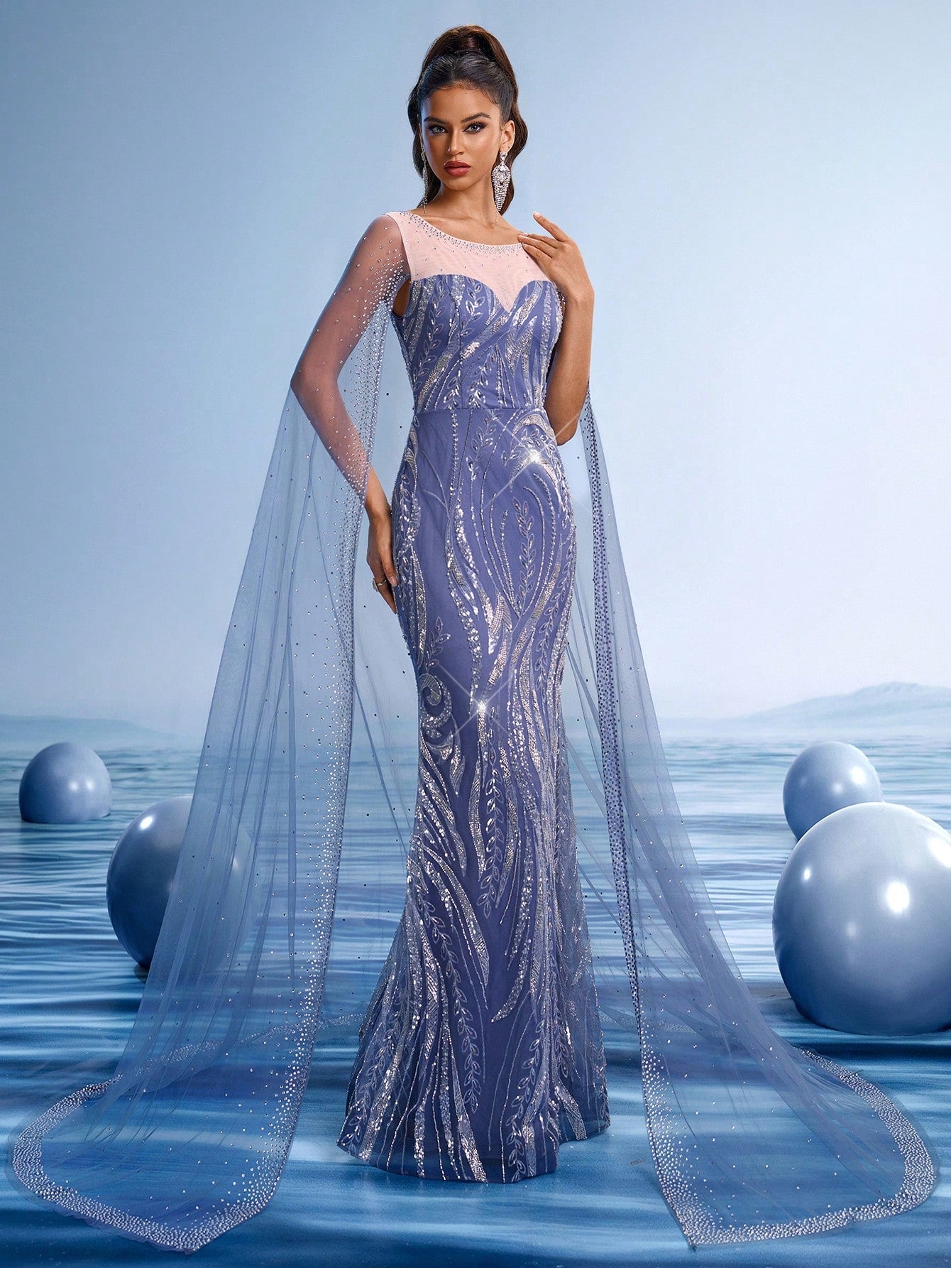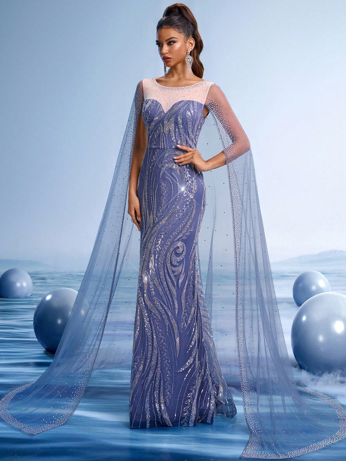 Stunning Navy Blue Embroidered Evening Gown with Sequin Details and Flowing Cape Shawl