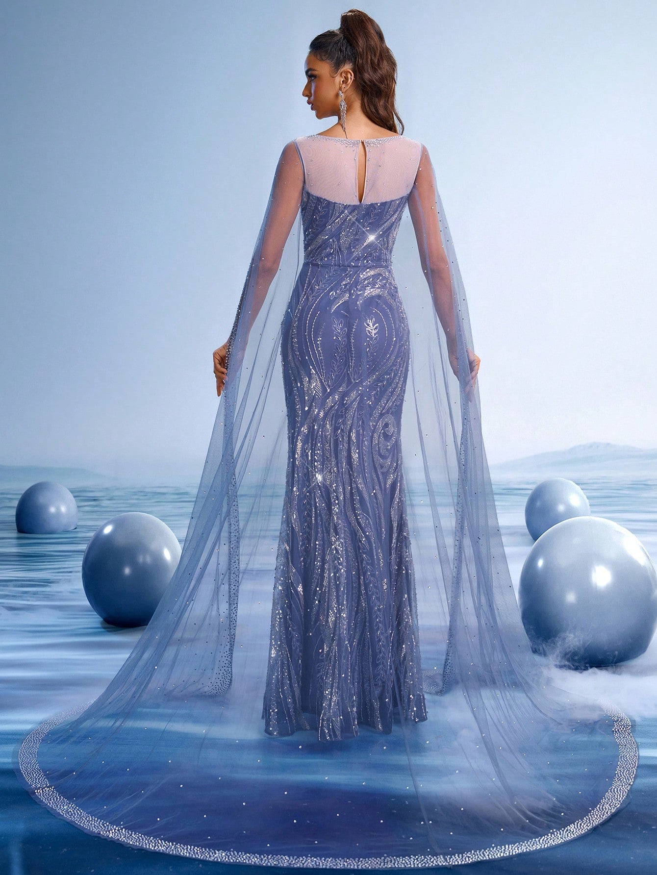 Decrease quantity for Stunning Navy Blue Embroidered Evening Gown with Sequin Details and Flowing Cape Shawl