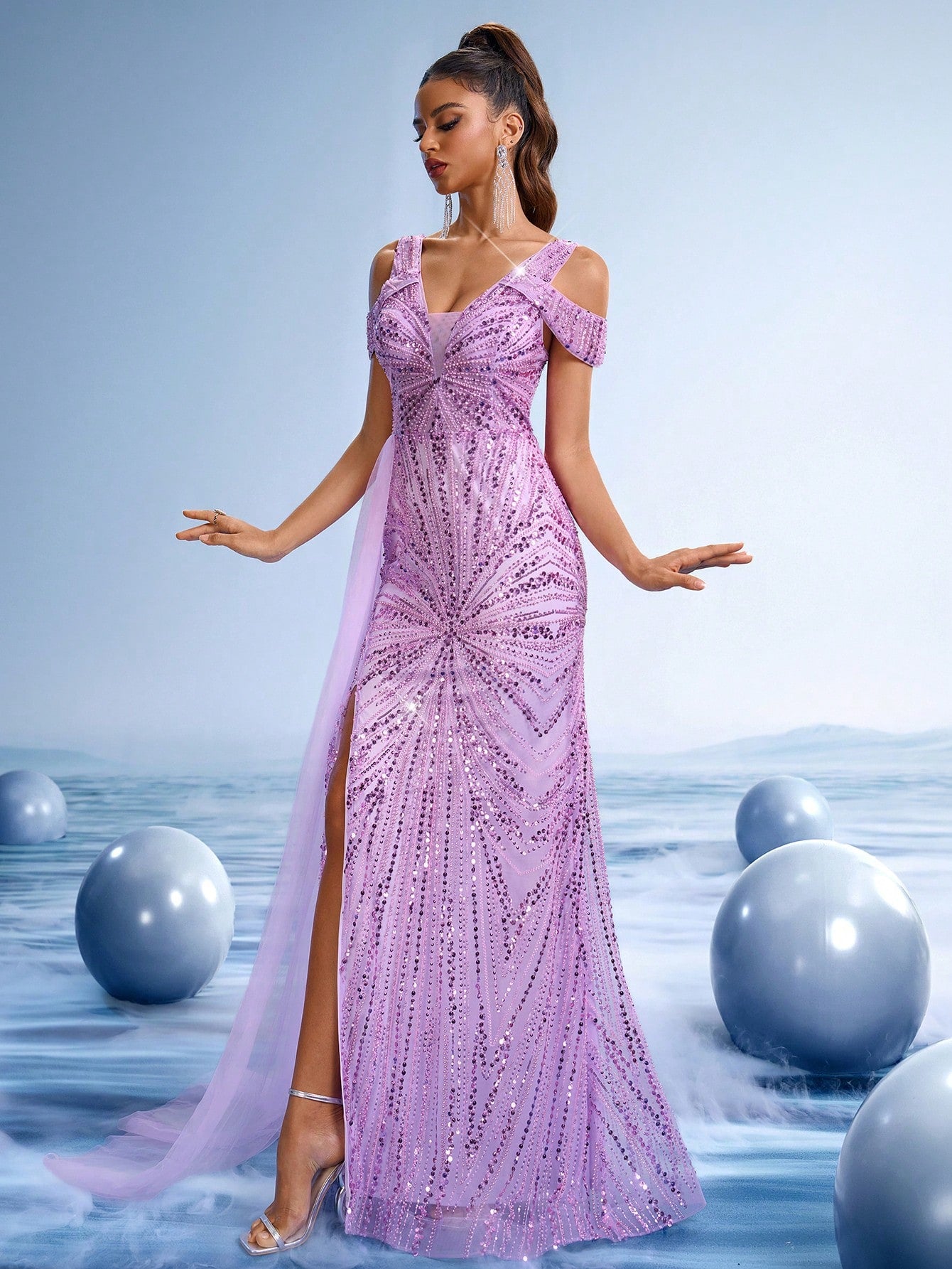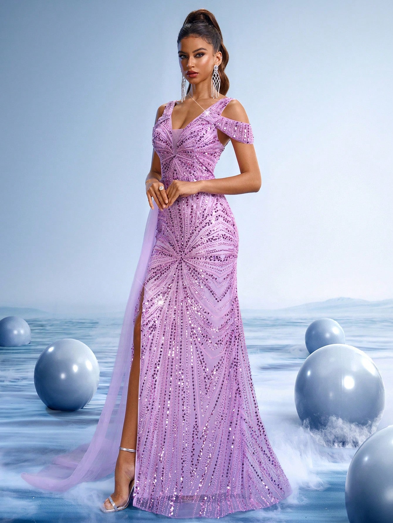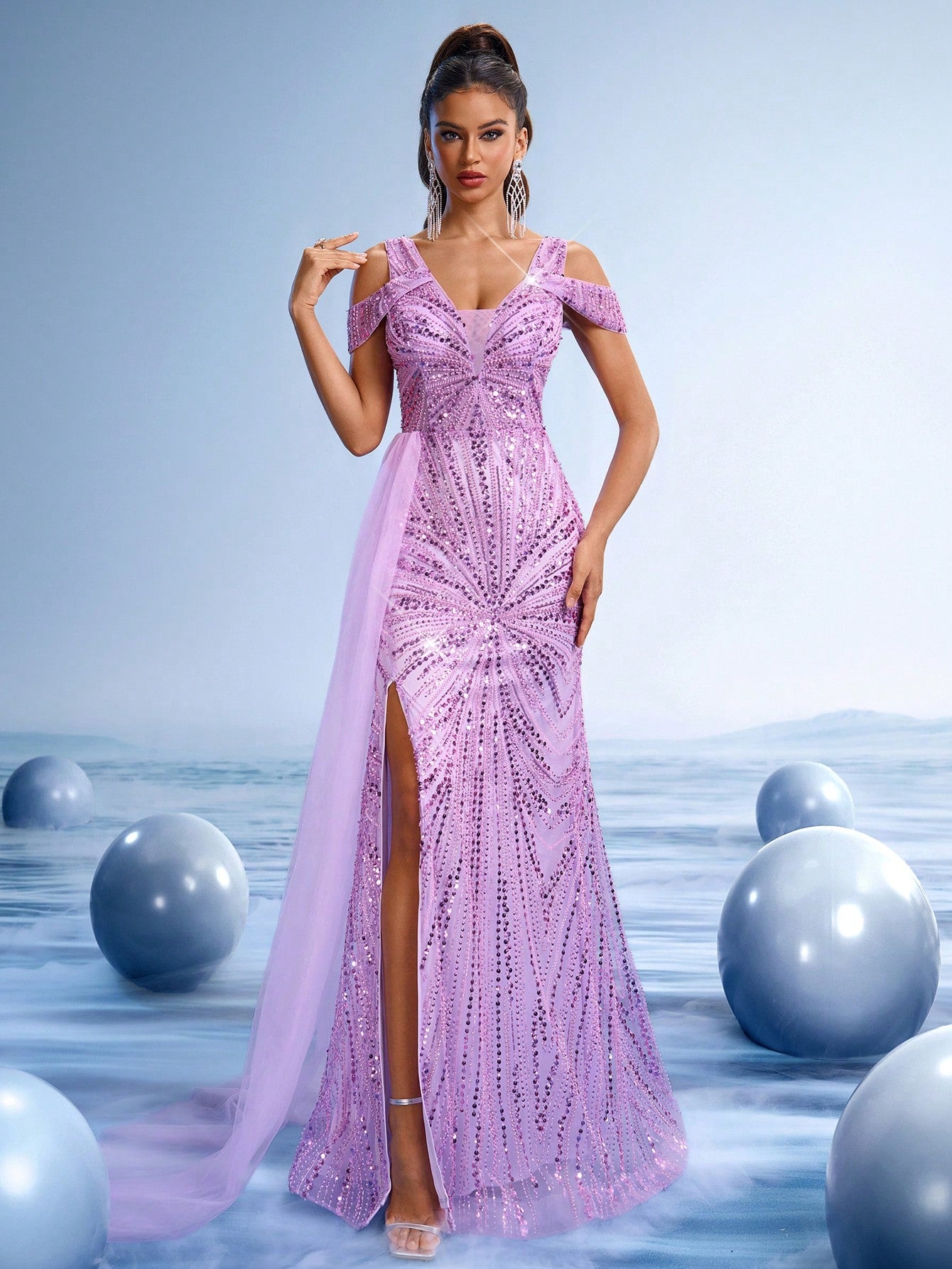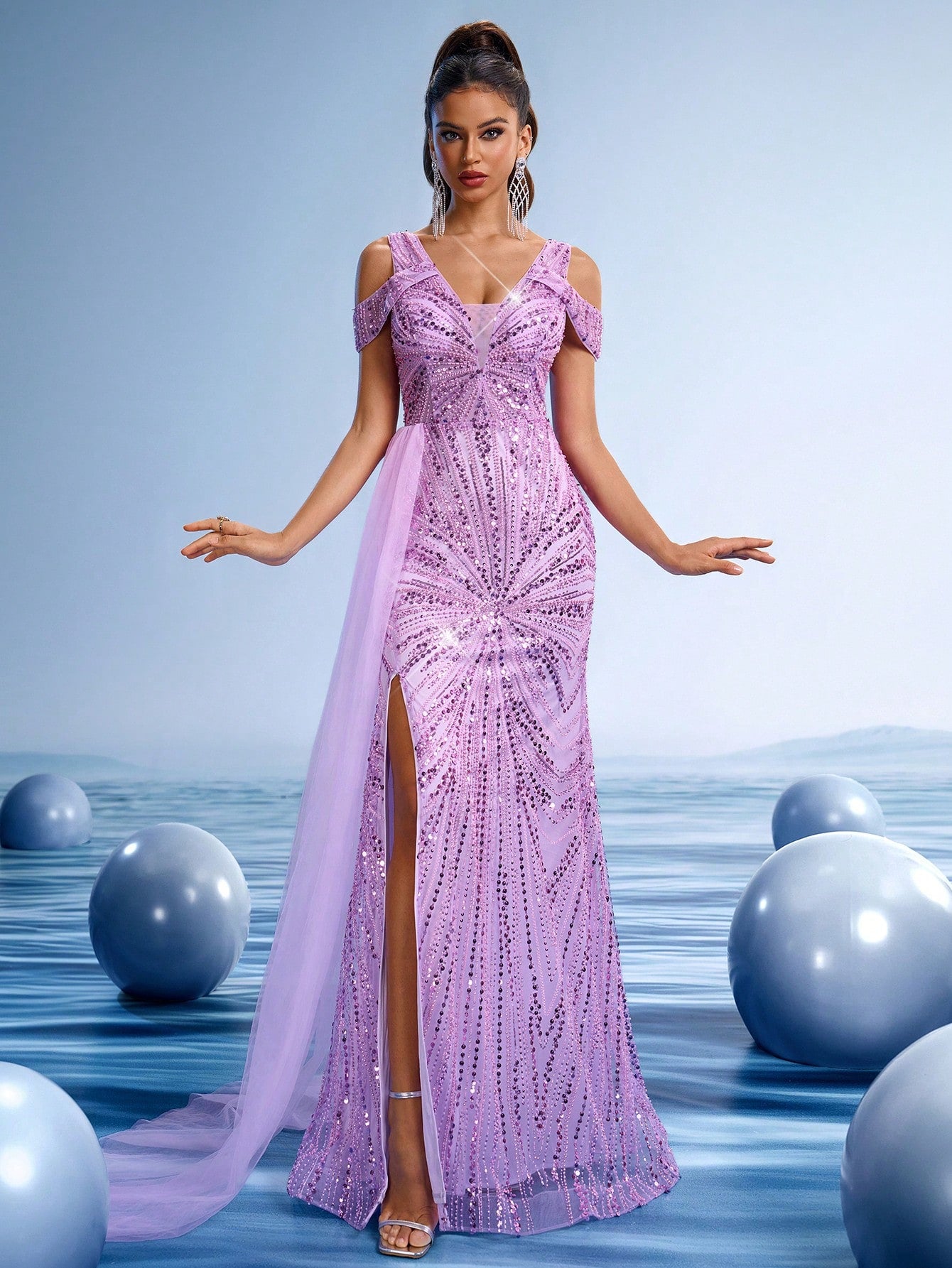 Increase quantity for Luxury Lavender Tulle Sequin Evening Dress