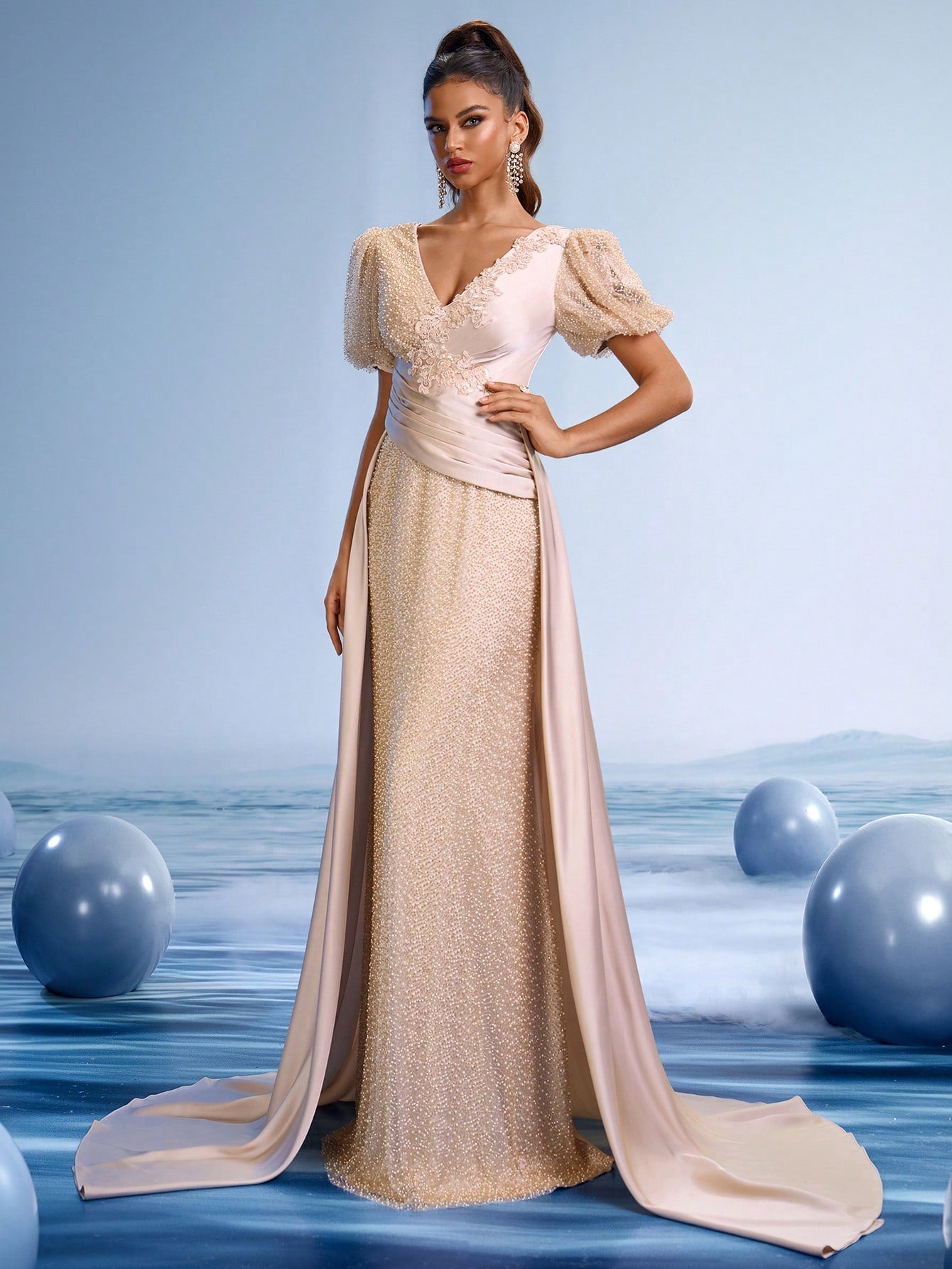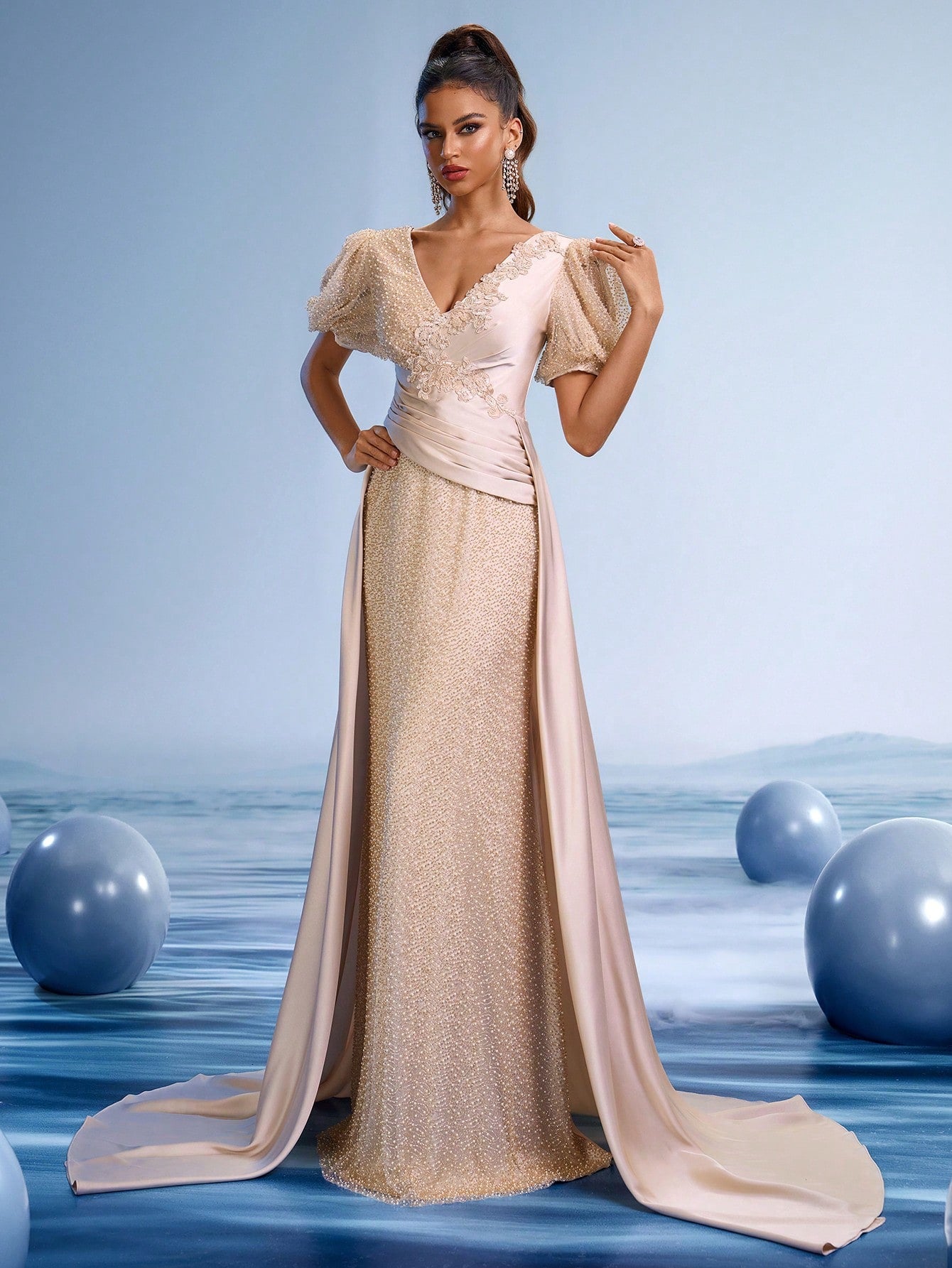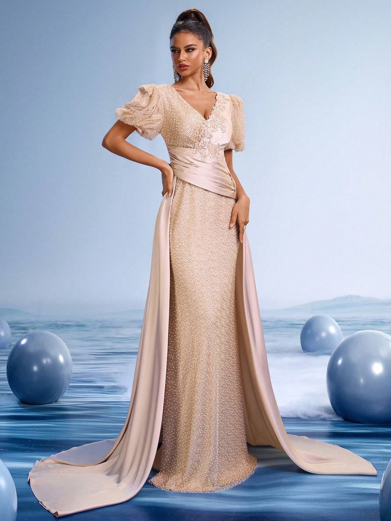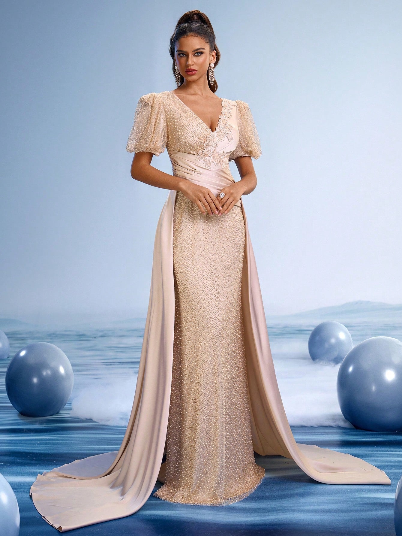 Increase quantity for Elegant Champagne Beaded Mermaid Evening Gown