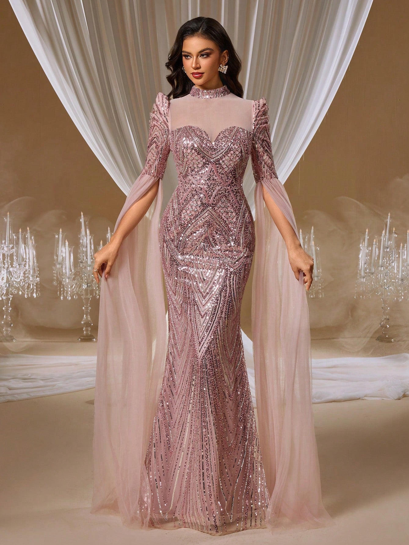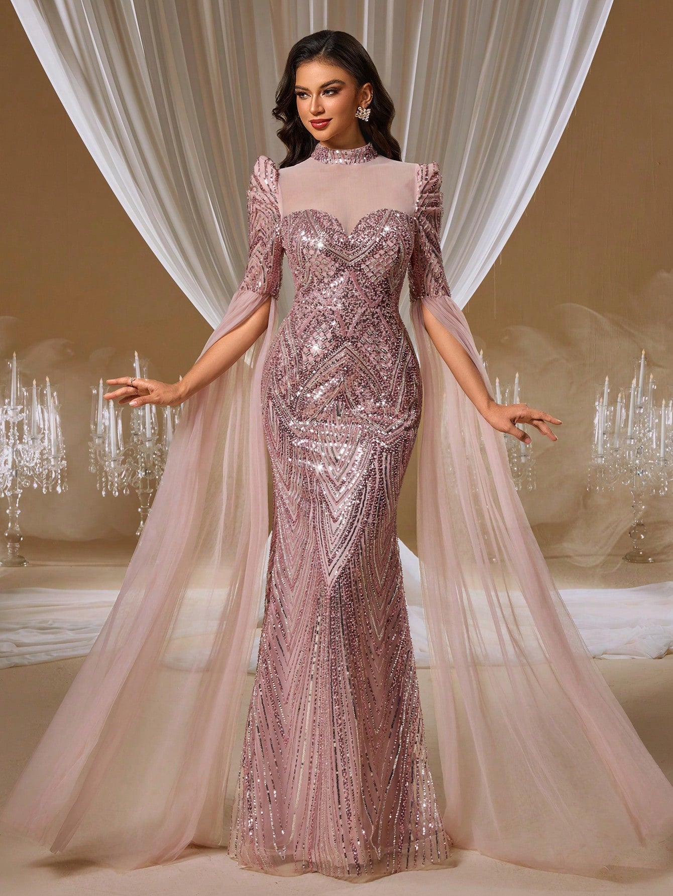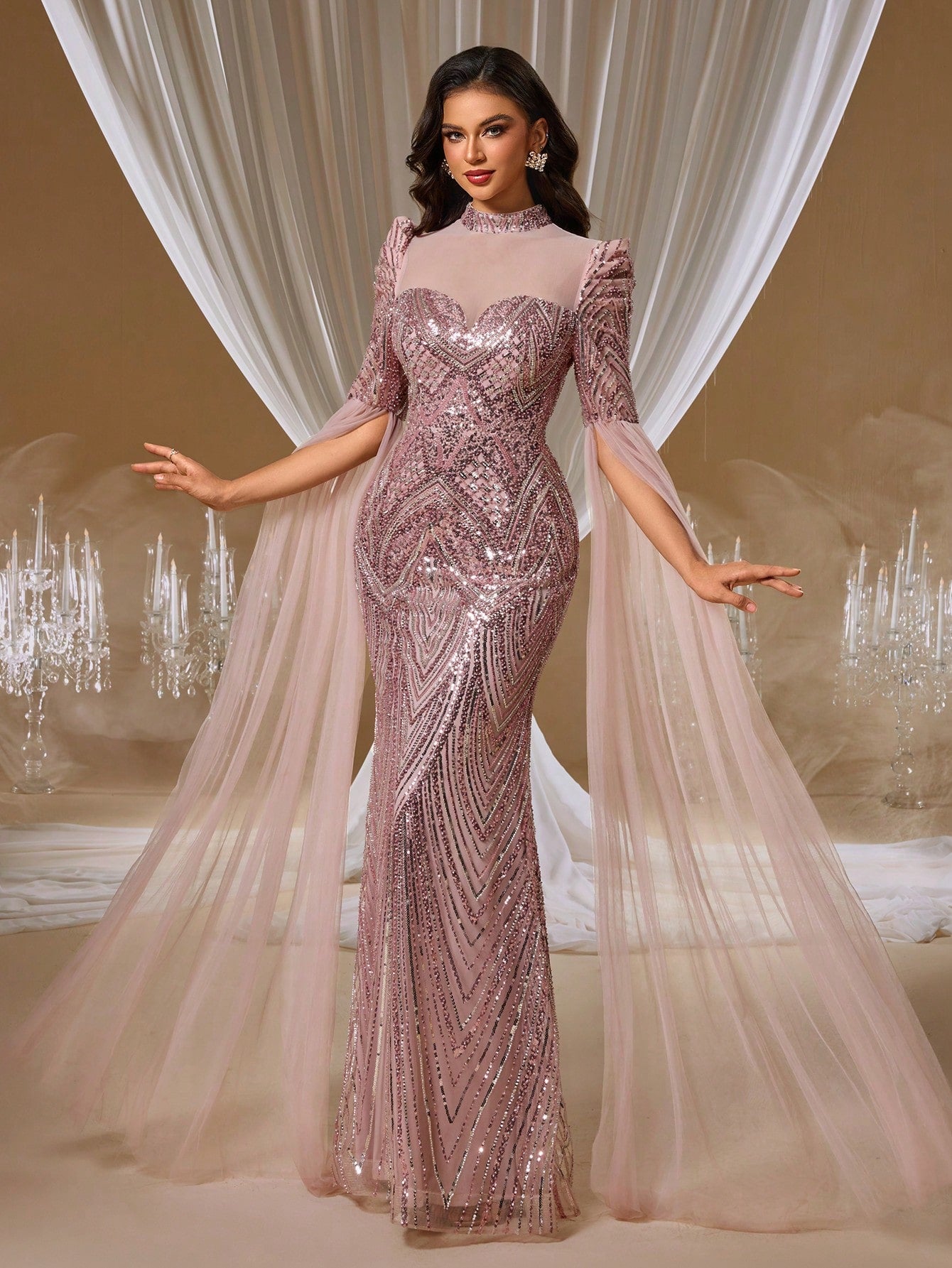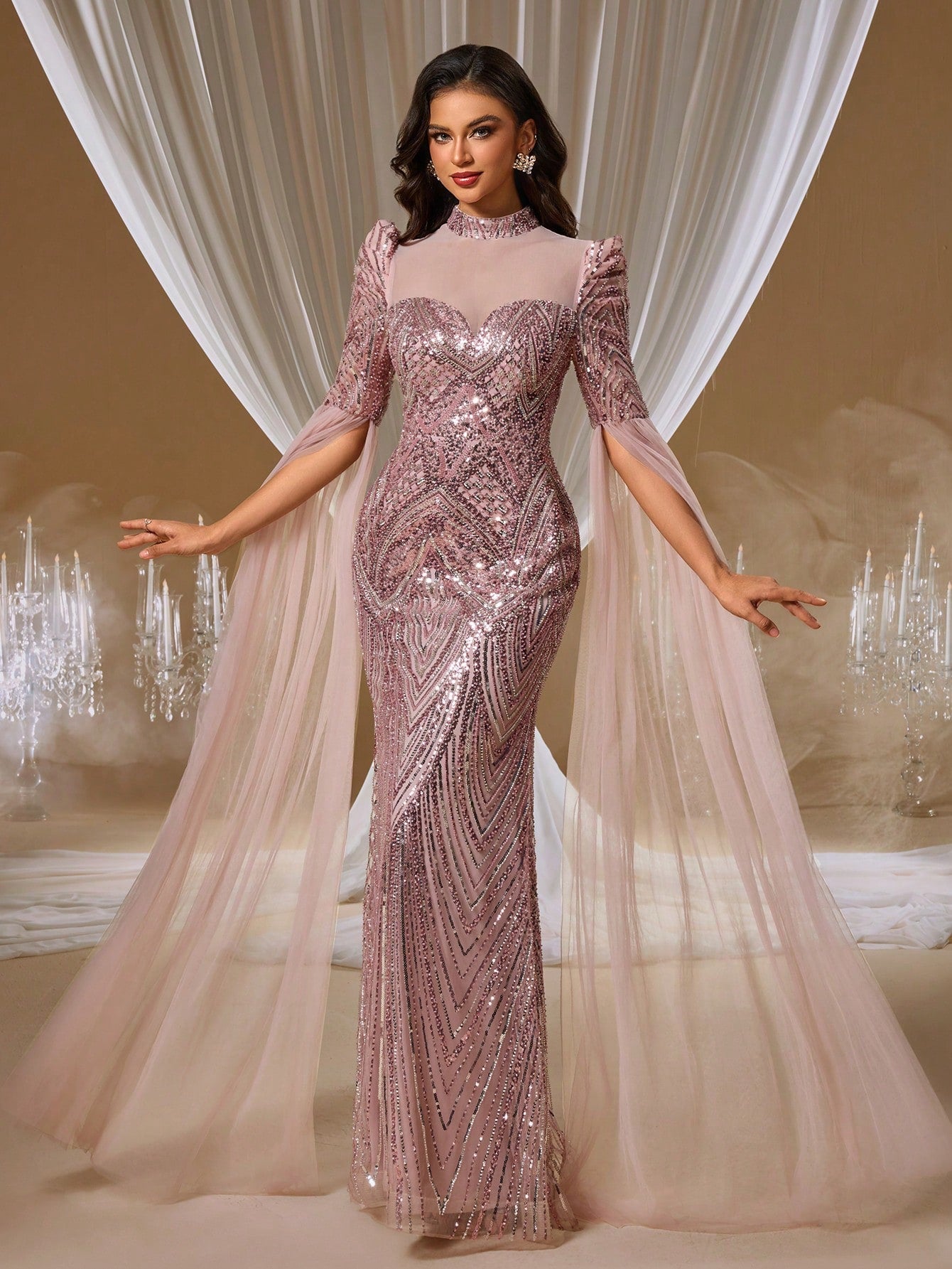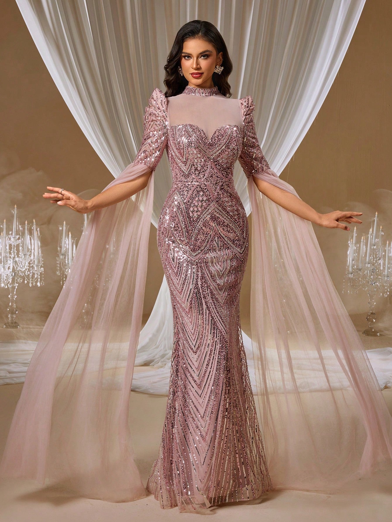 Romantic Rose Open-Back Evening Gown with Floral Embroidery and Sheer Cape Shawl